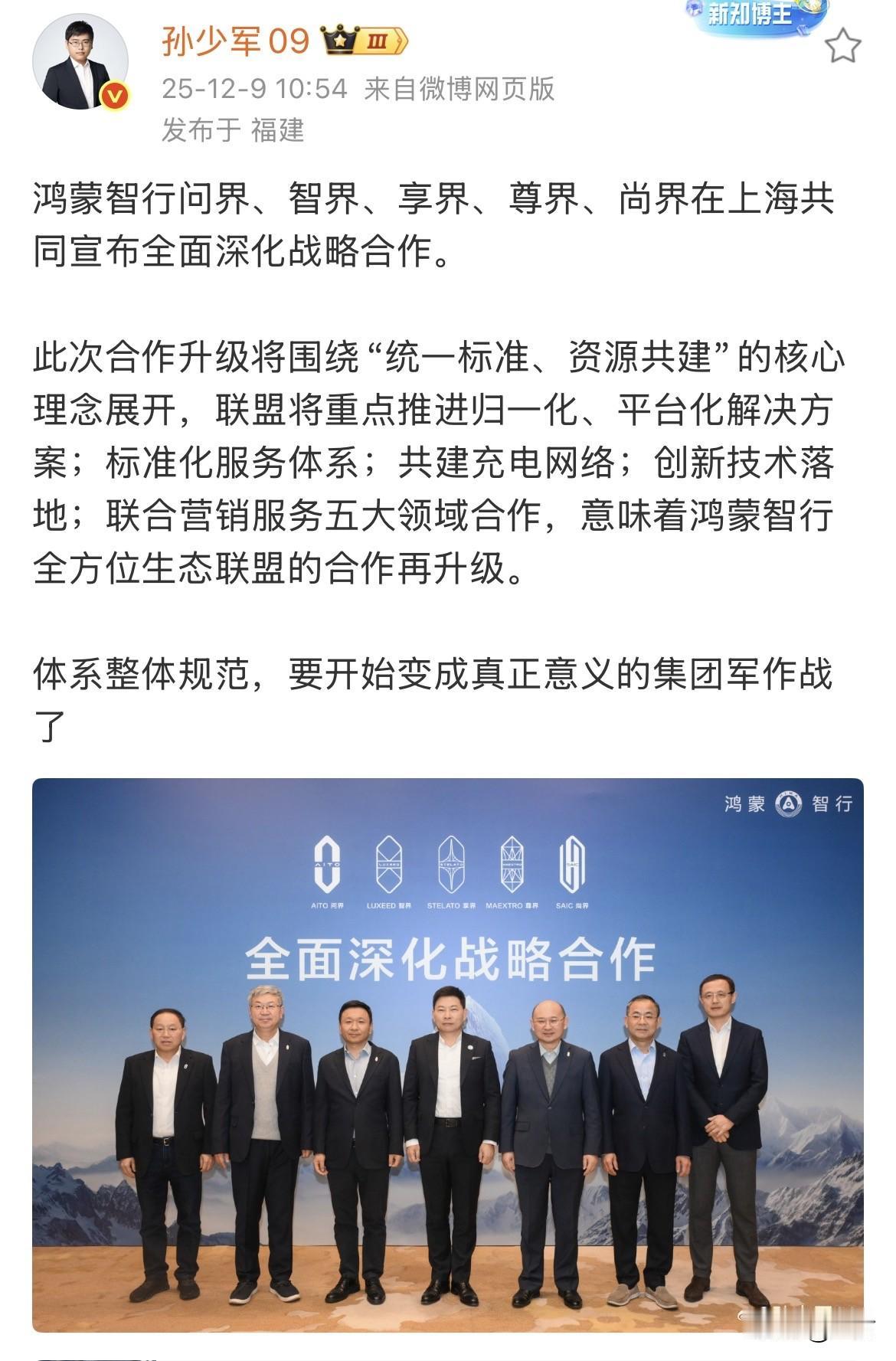 孙少军: 鸿蒙智行问界、智界、享界、尊界、尚界在上海共同宣布全面深化战略合作。 就在刚才,孙少军发出来一张照片,这张照片当中,余承东站在最中间的位置,两边是鸿蒙智行,以及其下的五界老板齐聚一堂。 今天下午他们会做一场直播,来比较详细的谈一下,他们会在战略上有哪些升级,根据前段时间预告片的宣传,今天这场直播也是央视进行的,到时候撒贝宁和小尼都会来。 根据孙少军现在发出的消息来看,这五个品牌接下来会在平台、服务、网络、技术等等方面进行再进一步的合作。 其实从某种程度上来说,这几个品牌他们既是战略伙伴又是相互的竞争对手,毕竟这几个品牌当中,卖得最好的应该是问界,无论是单车的定价,还是整体的产品定位,他在鸿蒙智行旗下,应该算是华为合作的比较成功的典范了。 所以他们互相之间还是有一些经验,可以相互取长补短,互相学习的。