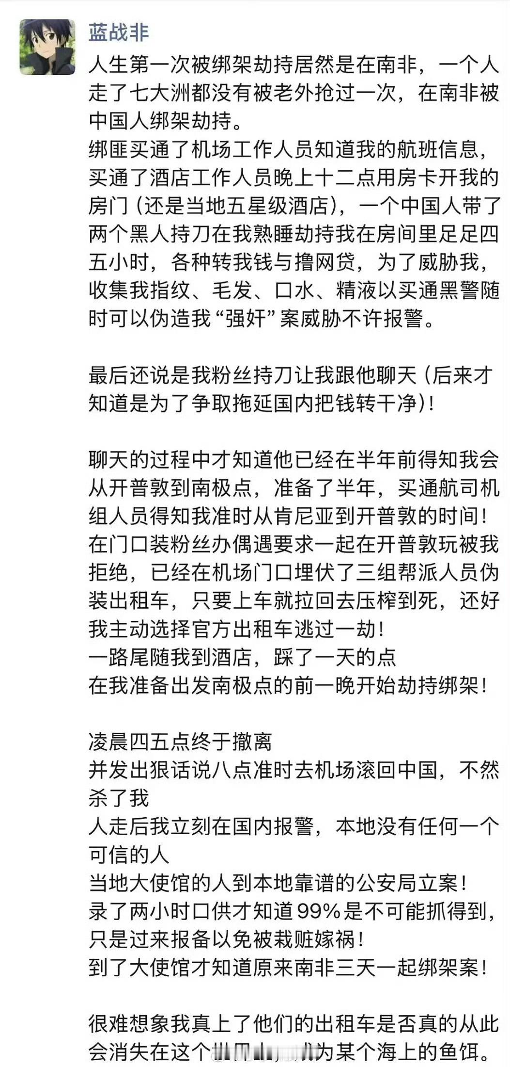 蓝战非称被绑架网红蓝战非勇闯南非,被南非的中国人绑架,准备充分,手法娴熟,团伙作案,据说劫走金额上千万?有人质疑是编造故事,我个人觉得很真南非东南亚这种地方出现这种事并不奇怪,尤其是针对中国网红有钱人孤身前往的很危险,这些地方本来就落后,法律不健全,各种治安监控设备缺失,滋生犯罪,遇到这种事,基本别想侦破,别指望当地警察,警察可不比国内,懂得都懂,保住命回来就偷着乐吧,建议大家真不要独自一人去这种地方啊蓝战非称被绑架
