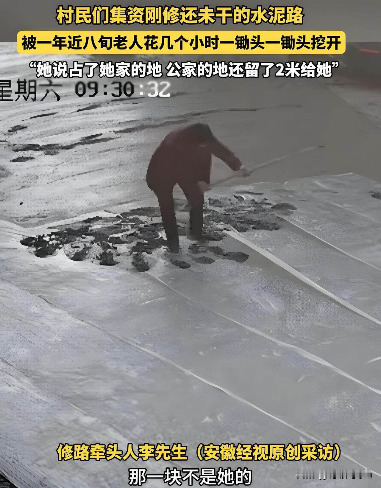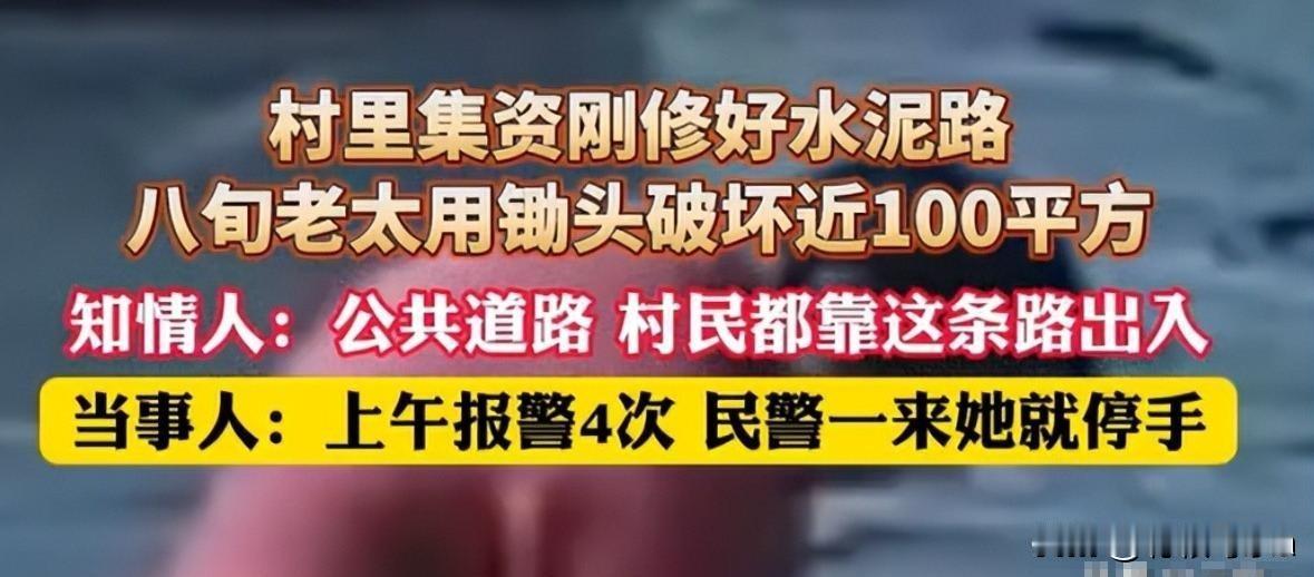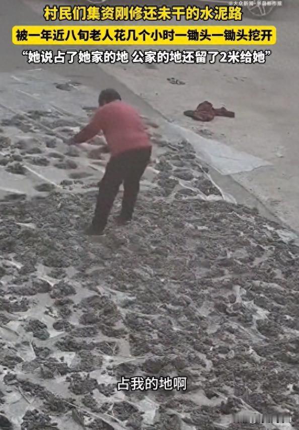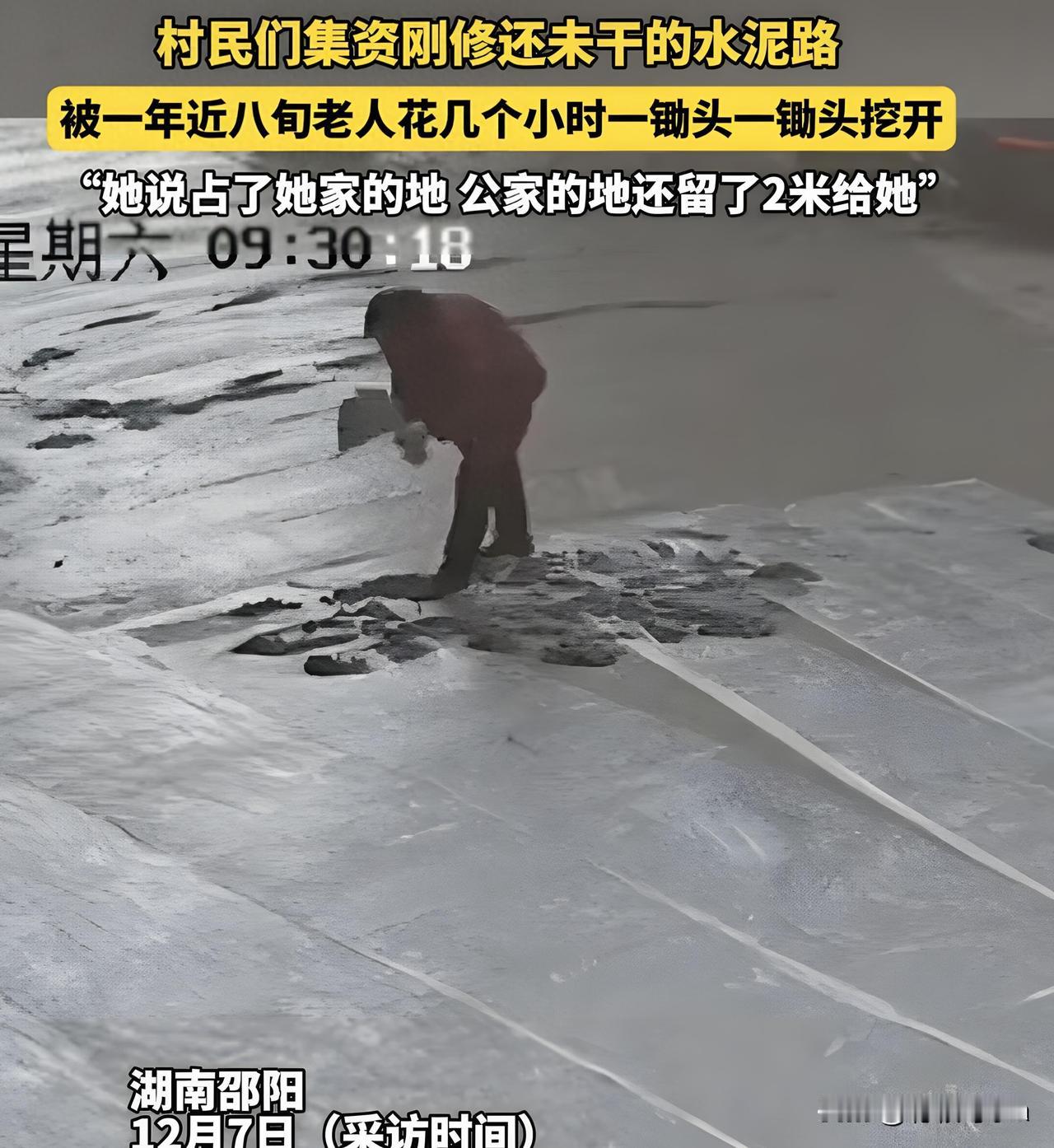 一锄头下去是人心:别让 “见不得别人好” 作祟!八旬老太砸村路 2025年12月7日,湖南邵阳新宁县某村,老太太在路上挥锄头,八旬高龄啊,她破坏的是水泥路面,修路人是李先生,好像是亲戚关系,村民集资修路,想出行更方便点,结果被老太太拦住了,持续了三个小时啊,一百多平方的路面都坏了,报了四次警都没用。 土地归属是个问题,老太太说祖辈传下来的,修路占了她的地,李先生跟村民说,这是公共路口,其实不只是土地的问题,是亲戚之间的矛盾,老太太不想接受李那个什么,咽不下这口气。 村民们寒心啊,觉得老太太阻碍发展,网友也议论纷纷,说她“嫌人穷怕人富”,建议赔偿,或者是拘留,最好是家里人出面解决,大家都在想,这到底是怎么一回事。 最好是家庭调解,胜过别人插手,双方冷静下来好好说,消除隔阂才行啊,要修路之前,村委会应该搞清楚土地是谁的,这样就能避免类似的事情发生,很多人看完这个故事,都会去想。 乡村公共建设很难啊,私人利益跟集体利益冲突了,社会心态也是问题,要警惕“见不得别人好”的情绪,老人应该以大局为重,家庭,村委会都应该帮忙调解。