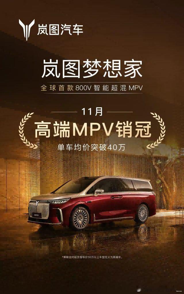 2025年11月高端MPV销量数据出炉,岚图梦想家以9027台的成绩,再次蝉联高端MPV市场月销冠军。燃油车时代,中国品牌受限于整体技术积淀与品牌影响力,未能在高端MPV领域推出标杆级产品。但在新能源时代遭遇了消费者的重新审视:为品牌支付的溢价是否值得?电动车能否提供比燃油车更好的体验?岚图梦想家稳守40万均价高地,累计销量也突破15万台,其中55%用户来自BBA等传统豪华品牌的增换购。每卖出3台高端MPV,就有1台是岚图梦想家。中国汽车正从“性价比优势”转向“价值优势”,这也意味着中国汽车开始掌握定义高端的话语权。高端MPV销量冠军2026款岚图梦想家