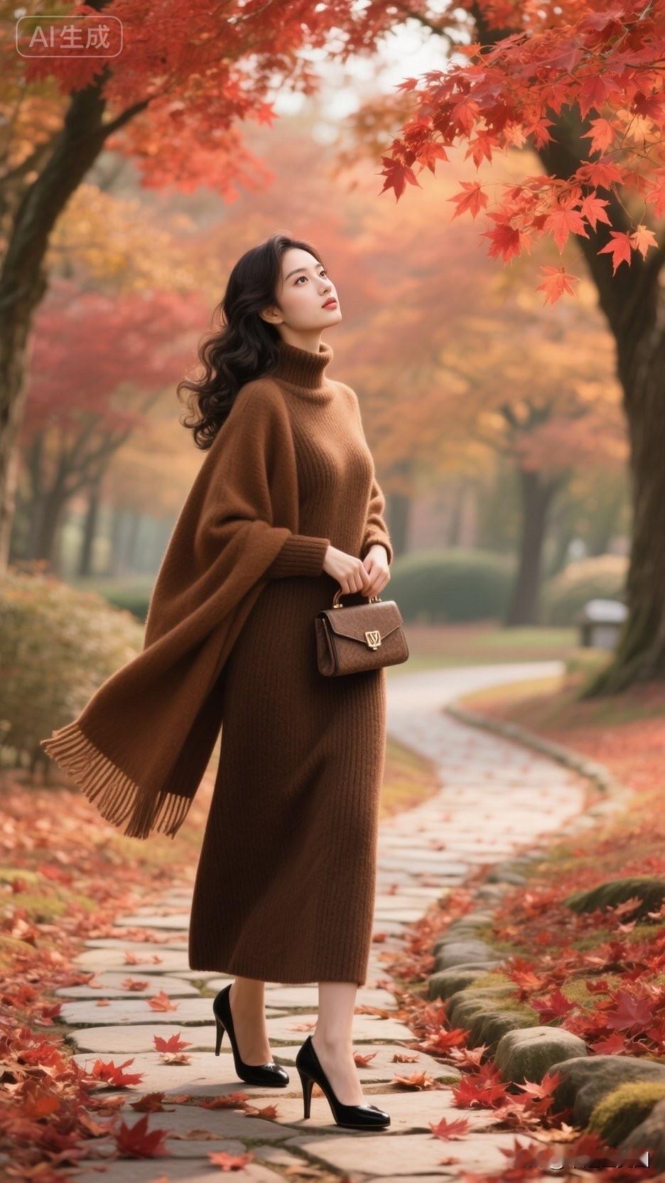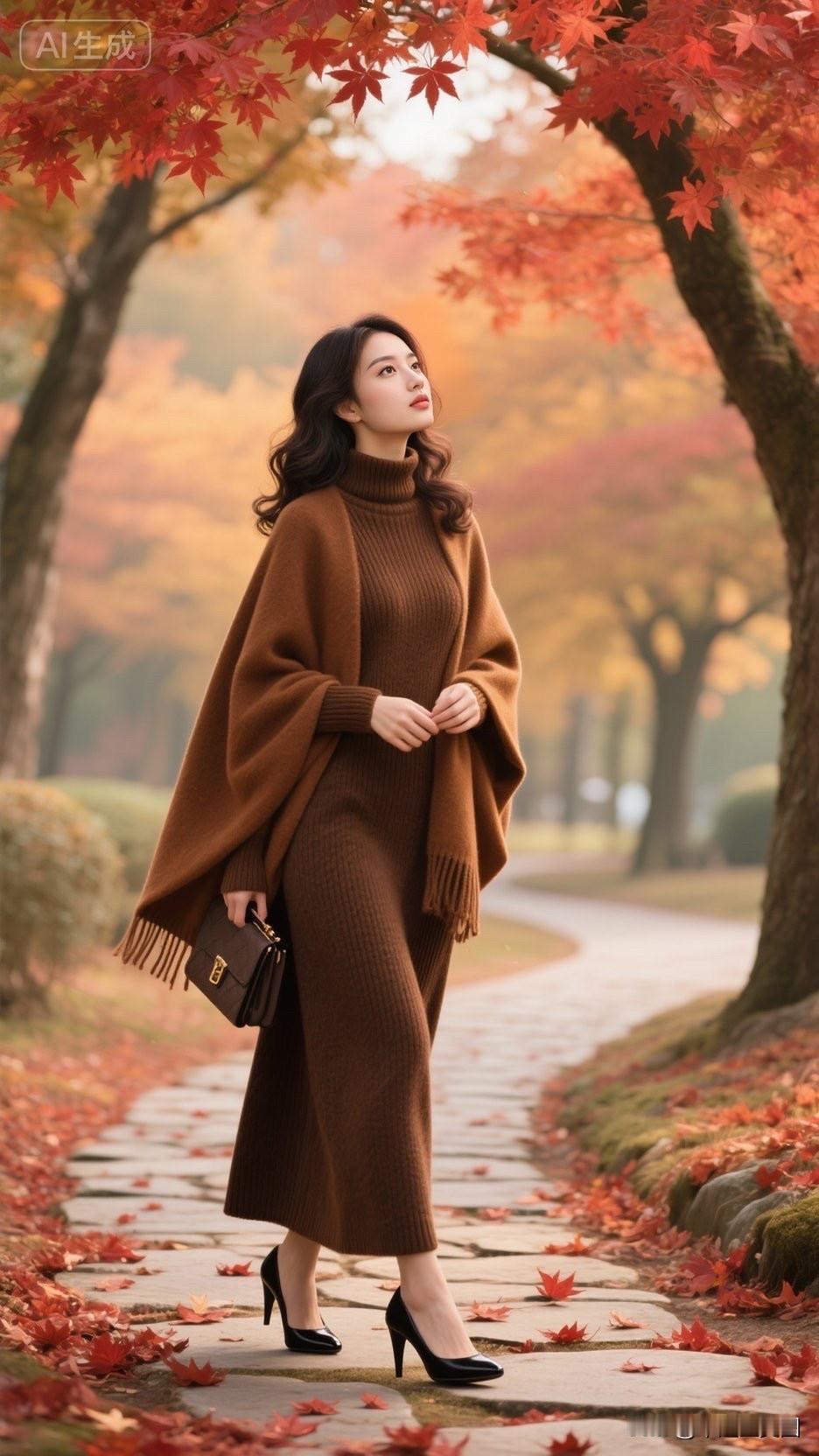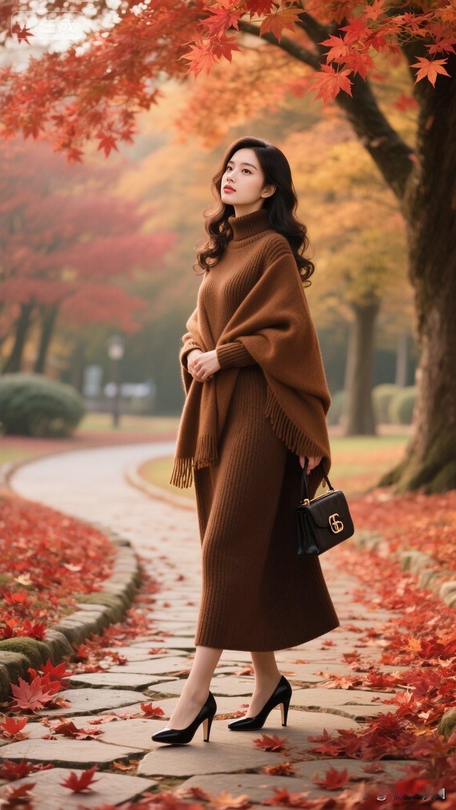 温柔甜美的少女,米色毛衣搭配飘逸长裙,尽显优雅气质。