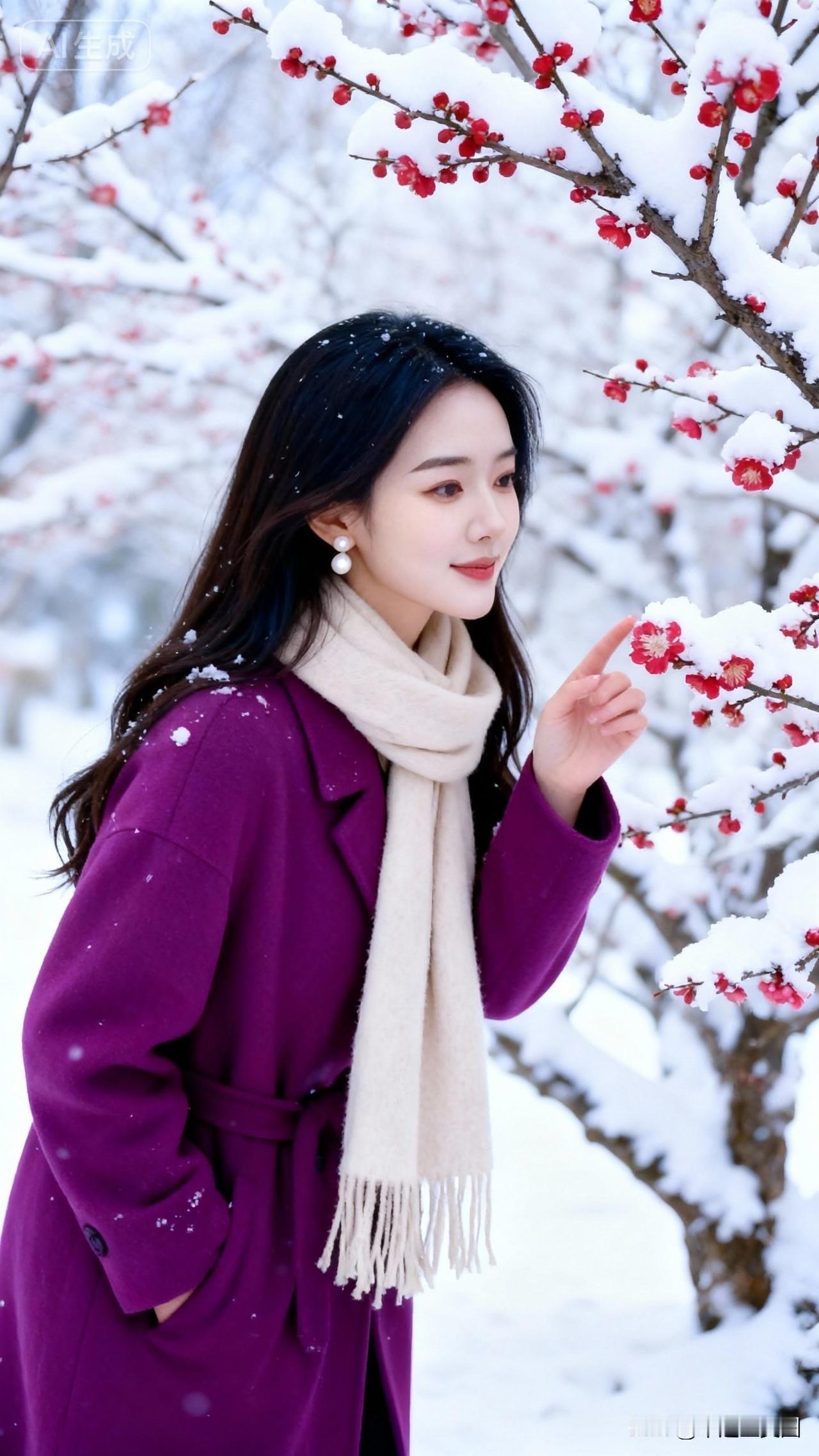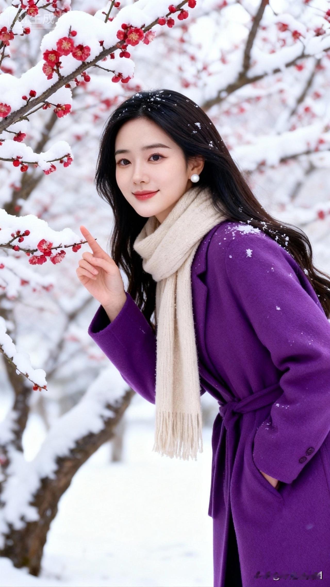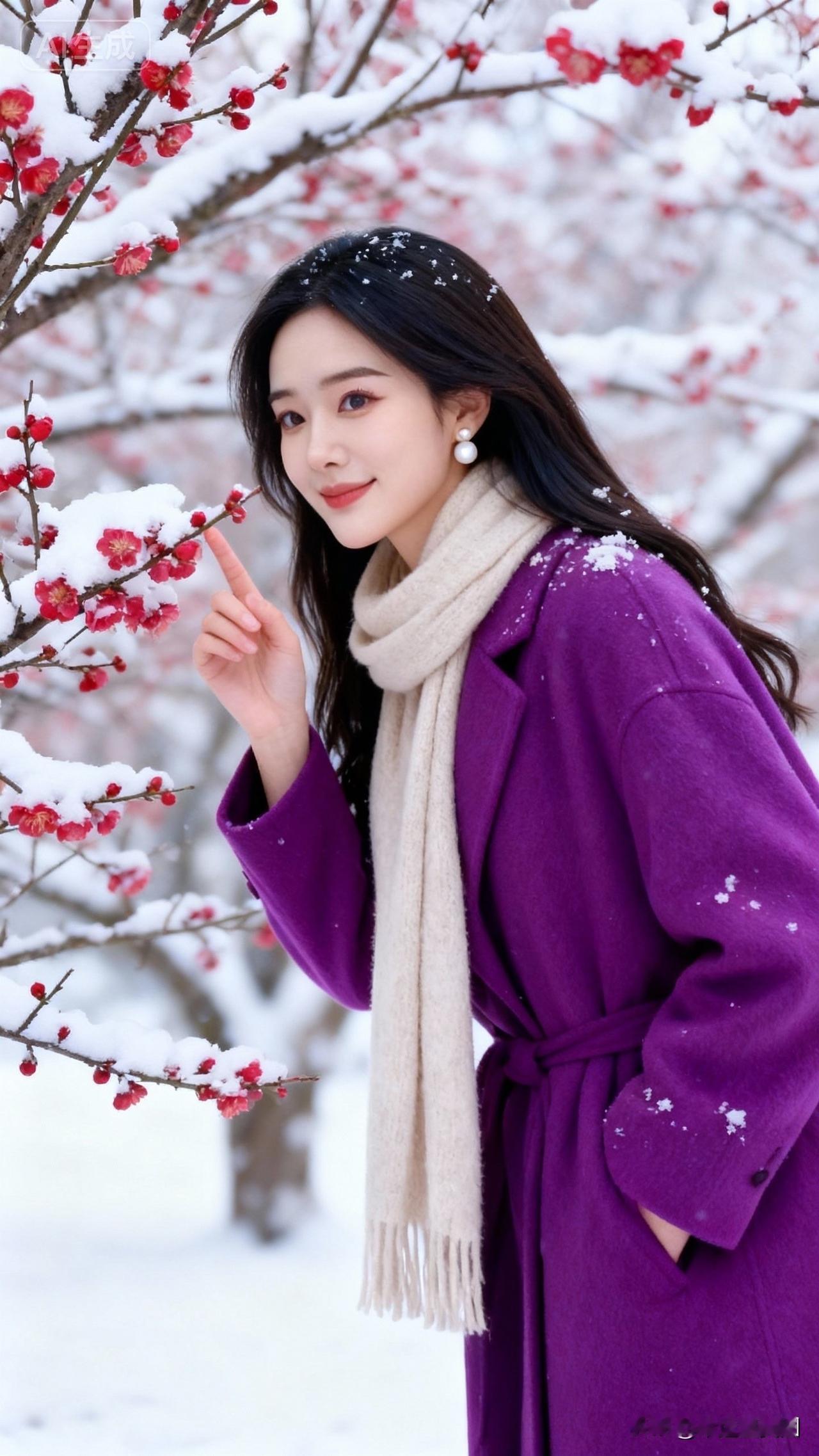 冬日雪景中的温柔少女,紫色大衣与白色围巾相得益彰,宛如童话中的公主。