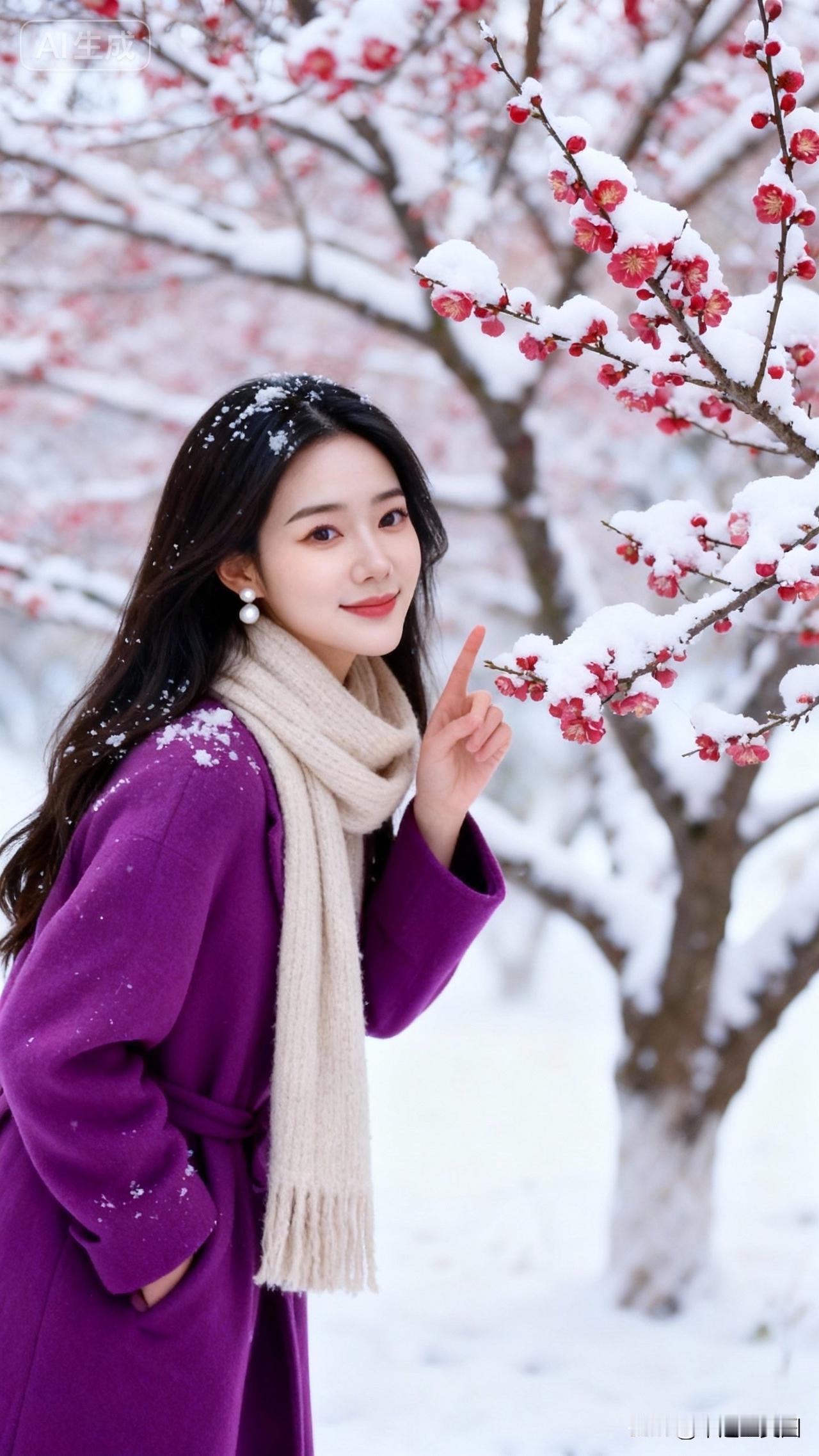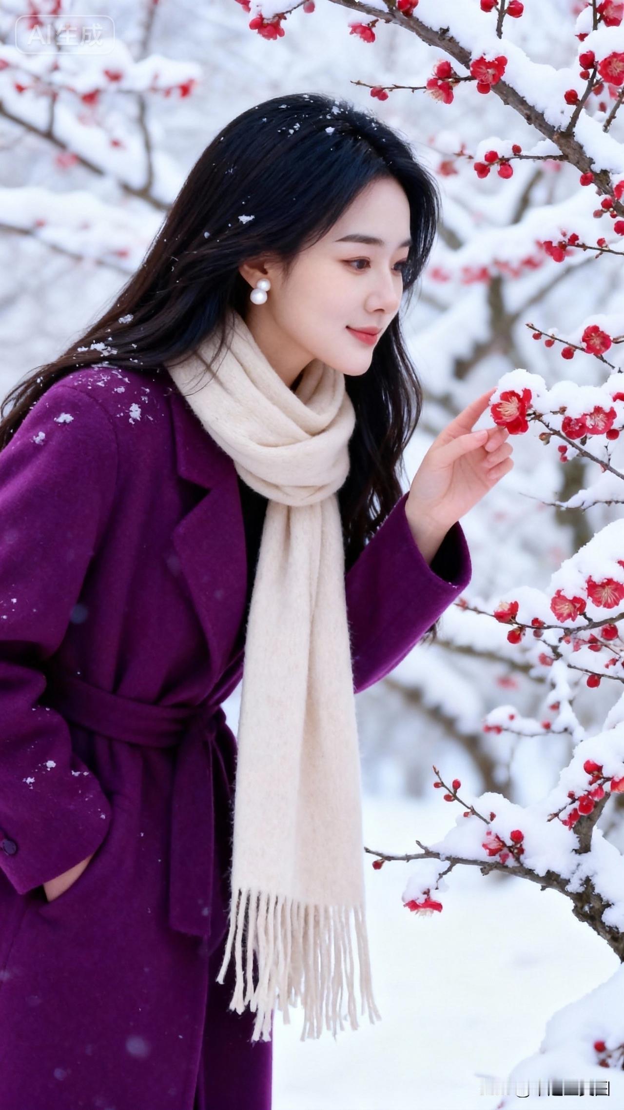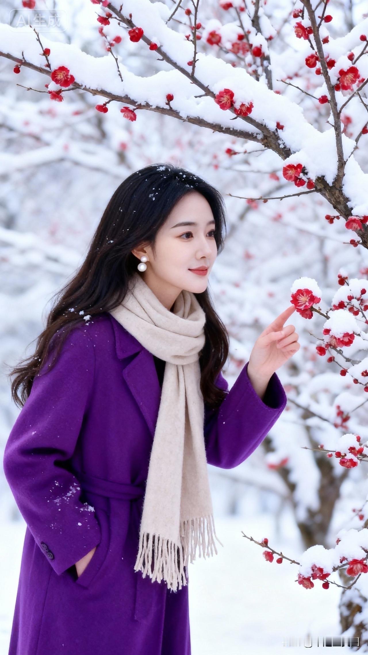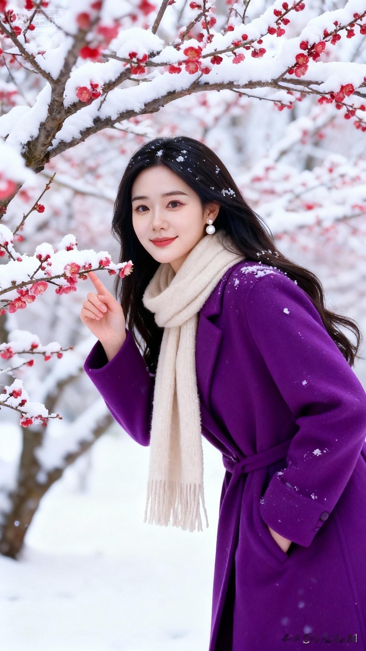 冬日雪景中的温柔少女,紫色大衣与白色围巾相得益彰,宛如童话中的公主。