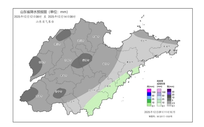 雨雪:12—13日,我省将出现大范围雨雪天气,累积平均降水量2~5毫米。其中,12日白天到夜间,菏泽、济宁、聊城、德州、滨州、东营、泰安、济南、淄博和潍坊有雨夹雪转中雪局部大雪,其他地区有雨夹雪转小雪局部中雪;13日白天到夜间,烟台和威海有小到中雪。