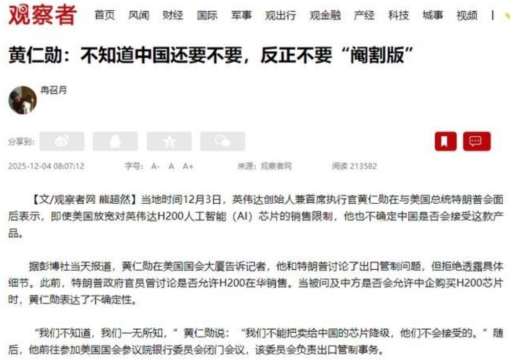 中国已经不需要美国的芯片了!当地时间12月3日,英伟达老板黄仁勋对特朗普直言,中国已经不稀罕美国的H200高端AI芯片了,就算美国放宽限制,中国也不一定要了。 说白了,美国高端芯片的“王牌”在中国市场已经彻底失灵,黄仁勋对着特朗普说的那句大实话,无非是捅破了这层窗户纸——咱们早就不稀罕靠别人的芯片过日子了! 要知道放在几年前,英伟达的高端芯片还是国内AI行业的“香饽饽”,别说H200这种顶级型号,就算是为了规避制裁“阉割”过性能的H20、H800,都得靠抢才能拿到货。 可现在风向完全变了,黄仁勋亲自游说特朗普希望放宽限制,得到的却是自己都不得不承认的现实:中国市场已经不是那个离了美国芯片就转不动的市场了。 很多人可能不知道,黄仁勋这次的表态不是空穴来风,背后是美国持续加码的芯片制裁和中国市场的反向突围。 这几年美国对中国的AI芯片管制就没停过,从最早禁售A100、H100,逼着英伟达搞“定制化阉割”,到后来连H20这种缩水版都要管控,一步步把路堵死。 可他们没料到,这种封锁反而成了国产芯片的“催化剂”,之前英伟达在中国市场的份额一度高达95%,可黄仁勋自己都透露,现在已经跌到了50%,短短几年时间,国产芯片硬生生抢下了半壁江山。 现在的国产芯片早就不是“拿不出手”的水平了,最近的行业动态就能说明问题。 百度旗下的昆仑芯正在推进独立上市,估值已经冲到210亿元,刚发布的新一代芯片不仅有主打性价比的M100。 还有能应对超大规模多模态模型训练的M300,配套的天池超节点单个就能完成万亿参数模型训练,已经拿下了中国移动十亿级的采购大单,招商银行、南方电网这些大客户都在批量使用。 不止昆仑芯,寒武纪今年一季度的营收直接暴涨了42倍,连续两个季度实现盈利,之前还有传闻说字节跳动要向它下大额订单,虽然消息没证实,但足以看出国产芯片的市场认可度。 更关键的是,整个国产芯片产业链都在加速成型,之前大家担心的生态兼容问题,现在也在逐步突破,昆仑芯正在推进和DeepSeek等大模型的适配。 华为昇腾凭借全栈优势占据了高端市场,海光信息在政务金融领域站稳了脚跟,加上壁仞科技、摩尔线程这些新锐企业,形成了多点开花的格局。 根据行业预测,今年国产芯片在国内AI服务器市场的占比能达到40%,和进口芯片几乎平分秋色,到2027年人工智能GPU的自给率更是要冲到82%,这些数据不是凭空来的,是国内企业一笔笔订单、一次次技术迭代堆出来的。 我认为自力更生,发奋图强,总有一天,中国芯片及制造设备会与世界一流抗衡,现在的突破只是开始。 虽然我们得承认,在最前沿的大模型训练单卡性能上,和英伟达顶级产品还有差距,但通过算力集群搭建、算法优化这些方式,已经能满足绝大部分国计民生领域的应用需求。 黄仁勋之所以着急游说特朗普放宽限制,本质上是怕彻底失去中国这个庞大的市场,毕竟之前H20芯片被管制后,英伟达光库存减值就高达几十亿美元,中国市场曾经是他们的营收重镇,现在却成了他们的“心病”。 以上只是个人看法,中国芯片的自主之路还在持续推进,从被“卡脖子”到逐步实现替代,每一步都走得很扎实,对于现在国产芯片的发展态势,你觉得哪些领域的突破最值得关注?又或者你对国产芯片的未来有什么期待?欢迎在评论区交流讨论。