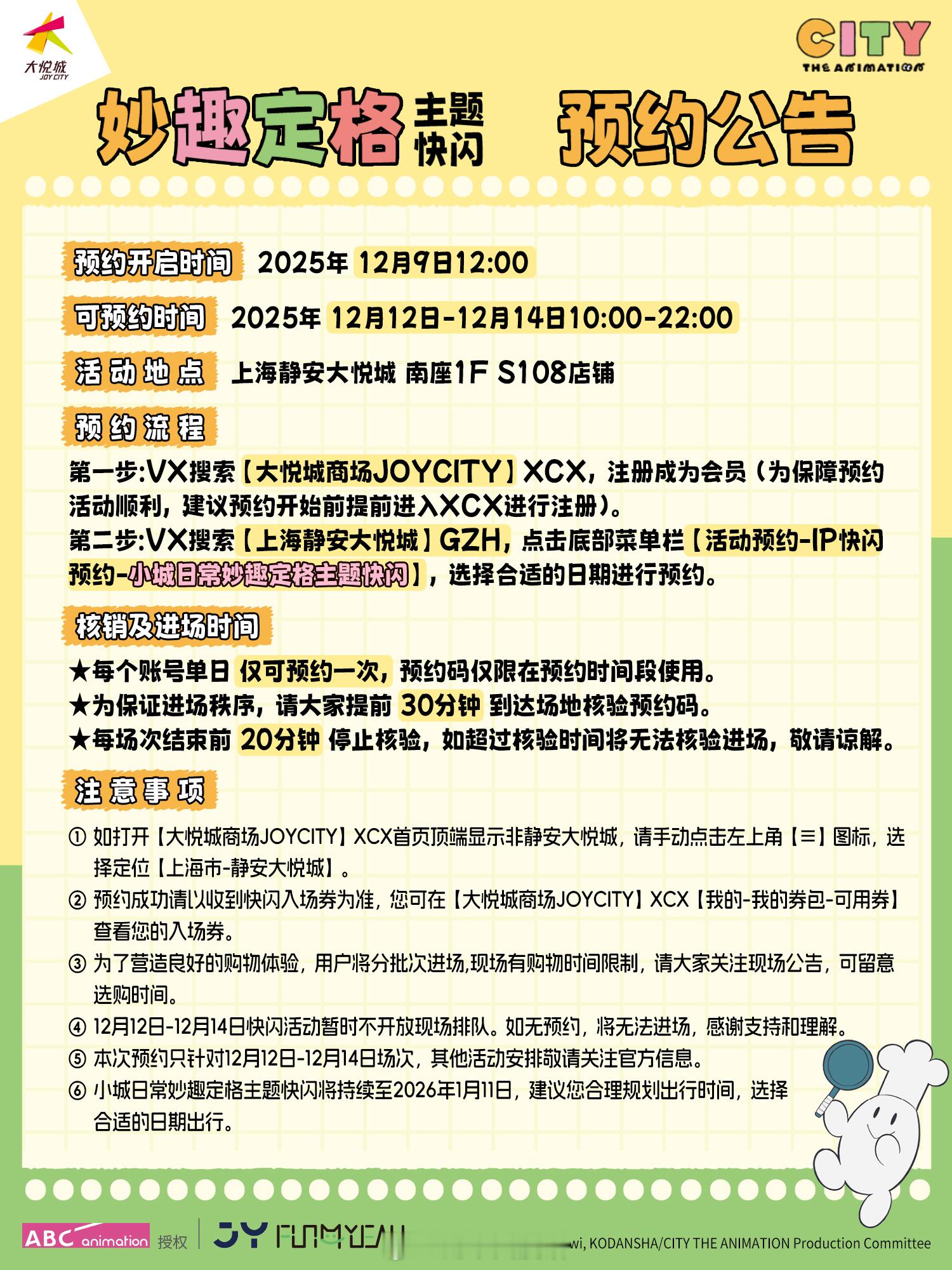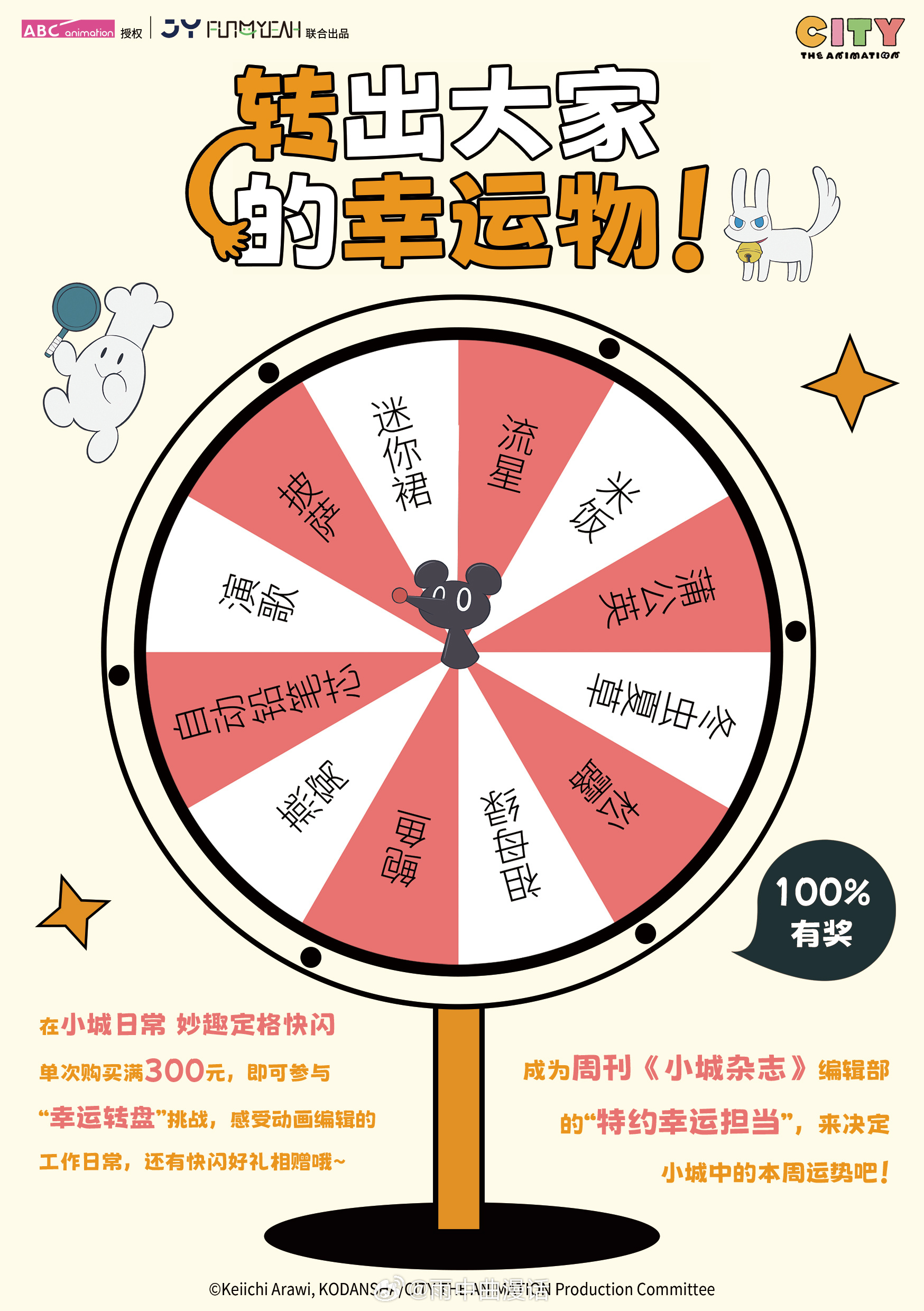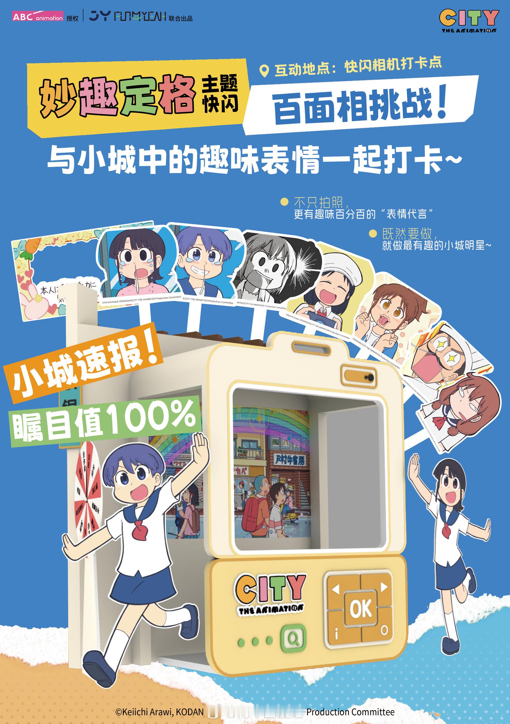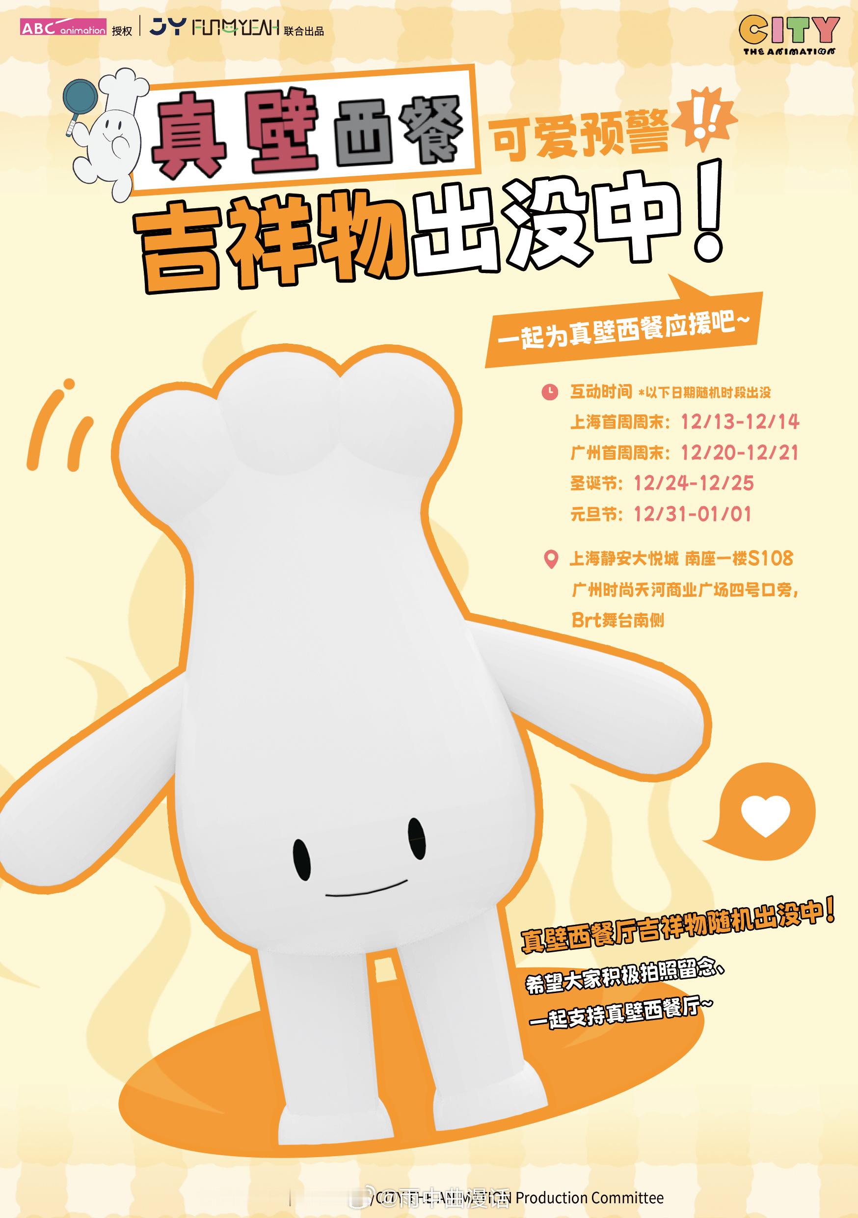 动漫小城日常小城日常妙趣定格快闪京阿尼小城的清晨 鸟儿在枝头歌唱,午后暖暖的阳光洒在树上,傍晚炊烟袅袅, 这才是生活最本真的模样。《小城日常》着周边以及更多还原动画细节来啦!更多妙趣定格主题快闪,还原动画的幸运物大转盘、温暖贴贴的真壁吉祥物、小城居民百面相手举牌、还有免费盖章处和小镇居民评选墙,猛戳图片了解更多活动细节↓↓↓快来现场一探究竟~ 南座一楼S10812.12-1.18广州时尚天河商业广场四号口旁,Brt舞台南侧