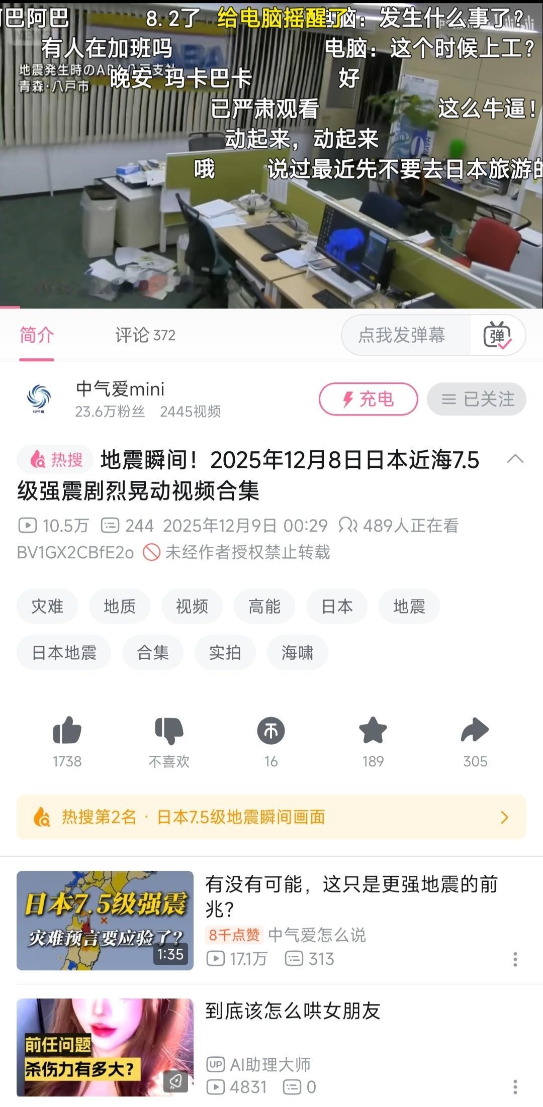 日本强震超10万人需避难 12月08日22时15分在日本本州东部附近海域发生7.6级地震,同区域再发6.6级余震。隔壁站up中气爱mini视频合集直观呈现了地震瞬间强震带来的剧烈晃动。本次地址已发生人员伤亡,并且预估算造成83万亿日元经济损失,关注本次地震灾害情况的朋友可以通过该视频直观感受,后续发展也可以在破站蹲一下。在此,也提醒近期有工作、学习、出游计划的朋友避开震区尽可能延缓出行,同时也希望在日的同胞注意防范地震灾害,尽快避难!日本地震