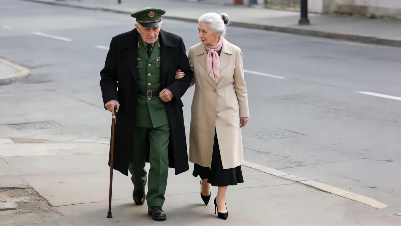 昨天街头偶遇的这对老夫妻,简直是岁月里的一道光。老爷子80多岁还身姿笔挺,红五星军帽配绿色戎装,气场十足,仿佛还带着当年的飒爽。而他的老伴,挽着发髻,颈间丝巾衬得气色温润,更绝的是居然踩着4厘米细高跟鞋,优雅又自信。 想想现在有些人觉得中老年男人戴军帽不时髦,可在老爷子身上,军帽就是他的勋章。就像八旬老夫妻穿婚纱一样,这对老夫妻在街头的模样,也是他们爱情和生活态度的展现。岁月或许在他们脸上留下痕迹,但他们依然活得精彩,让人打心底佩服。