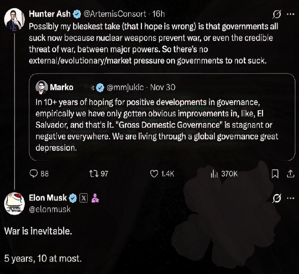 马斯克凌晨3点不睡觉, 直接给全世界泼了一盆凉水。 他在网上断言:战争无法避免,就在未来5到10年。理由很硬,全球债务问题就像一座大山,压得各国经济都有些喘不过气。很多国家为了缓解压力,不断印钞,可这又引发了通货膨胀等新问题,经济矛盾越积越多。 少子化现象愈发严重,年轻劳动力减少,社会养老负担加重。没有足够的新生力量,经济发展缺乏动力,国家之间为了资源和市场,更容易产生摩擦。 AI技术虽然给生活带来便利,但它的发展速度太快,一旦失控,后果不堪设想。它可能被用于军事领域,让战争变得更加残酷和不可预测。 面对这样的局势,普通百姓能做的很有限。我们只能过好当下,努力提升自己,增强应对风险的能力。也希望各国能通过和平谈判解决问题。