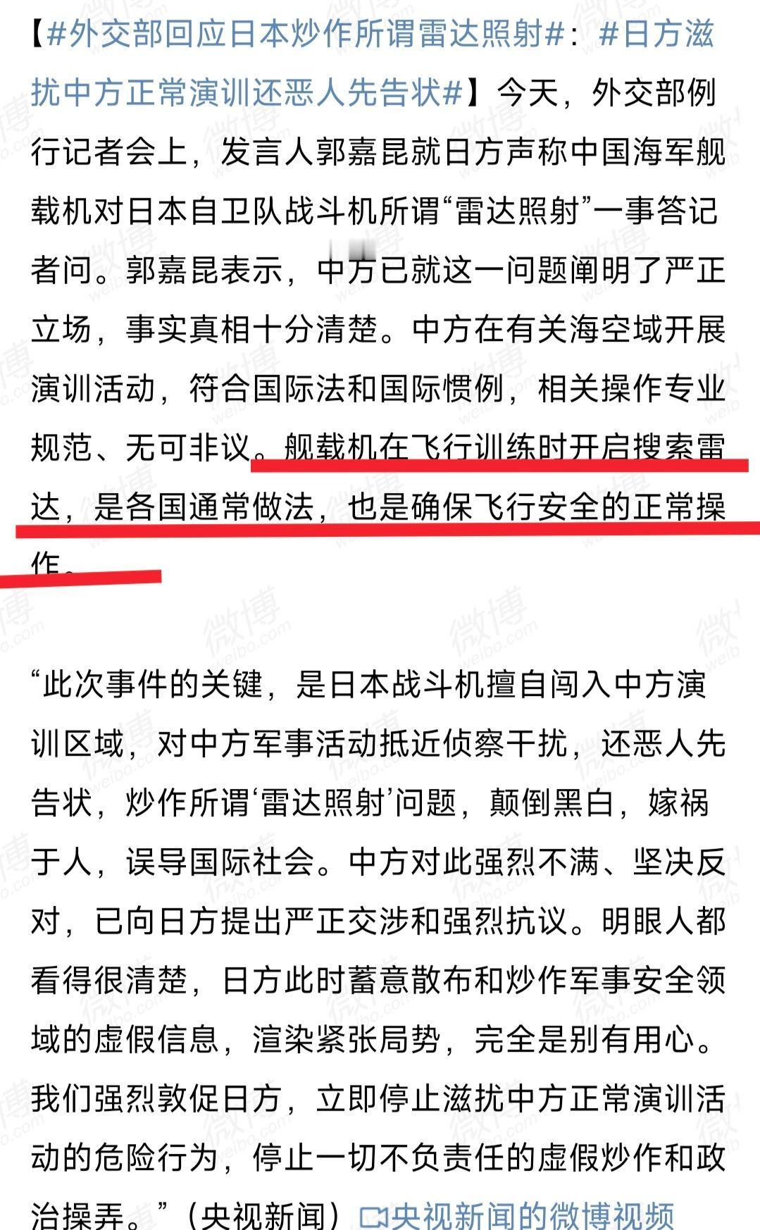 日本又在碰瓷!外交部一句话透露玄机,日本战机或根本没被锁定,高市打算重走侵略老路? 事情得从12月6日说起。当天,日本防卫省突然跳出来指控,称中国海军舰载机对日本自卫队战机进行了所谓的“雷达照射”。 日方的反应堪称歇斯底里,防卫大臣小泉进次郎在12月7日凌晨紧急召开记者会,大张旗鼓地提出抗议,随后还召见了中国大使。 日本媒体更是添油加醋,将“雷达照射”直接渲染为“遭火控雷达锁定”。 这种说法极具煽动性,意图将中国描绘成一个危险的挑衅者,而日本则是那个无辜的受害者。 一时间,一场由日方精心策划的“悲情大戏”似乎就要上演。 然而,就在日方以为可以“恶人先告状”,成功颠倒黑白之际,中方不慌不忙地出手了。 12月8日,在北京的外交部例行记者会上,发言人郭嘉昆的回应显得异常冷静,却字字千钧。 他没有陷入与日方纠缠“是否锁定”的技术细节之争,而是轻描淡写地抛出了一句关键的话。 郭嘉昆指出:“舰载机在飞行训练时开启搜索雷达,是各国通常做法”。这句话看似平淡无奇,实则透露了巨大的玄机。 “搜索雷达”和“火控雷达”完全是两个概念。 前者好比在黑夜里打开手电筒进行大范围探查,后者则是用激光笔精确瞄准一个特定目标。 中方特意点出是“搜索雷达”,言下之意再明白不过: 我们的飞机只是在正常训练,常规性地开启雷达确保安全,是你的飞机自己不知好歹,一头撞进了我们的扫描范围。 这根本不是主动的、带有攻击意图的“锁定”,而是被动的、常规性的“扫描”。 日方所谓“被锁定”的说法,从根本上就站不住脚。 中国外交部用最简单的一句话,就四两拨千斤地揭示了事件的本质,让日本的炒作显得无比拙劣和可笑。 中方的逻辑非常清晰,那就是直击问题的要害。问题的根本不在于雷达是否照射,而在于日本战机为何会出现在那里。 中国国防部早已明确指出,日机是多次冲闯中方事先划设并公布的演训禁区。 你跑到别人家门口进行危险骚扰,被主人家的安保系统扫到,回头却大喊“你威胁我”,这是何等的强盗逻辑? 面对这种蓄意碰瓷,任何技术层面的争辩都毫无意义,因为对方的目的根本不是为了厘清事实,而是为了制造事端。 因此,中方在北京和东京同时向日方提出严正交涉和强烈抗议,态度坚决,直指日方“颠倒黑白、嫁祸于人”。 那么,高市早苗政府为何要导演这出漏洞百出的闹剧?答案或许令人不寒而栗。 这起事件绝非孤立的,它与高市早苗上台以来的一系列危险动向一脉相承。 这背后,隐藏着日本右翼势力企图重走侵略老路的险恶用心。 就在上个月,高市早苗公然抛出“台湾有事就是日本有事”的谬论。 这种论调,与二战前日本军国主义炮制的“满蒙生命线论”何其相似! 都是通过渲染外部威胁,为自己的军事扩张和海外干预制造借口。 历史的剧本仿佛正在被重新翻开。当年,日本军国主义者为了侵略中国,自导自演了“九一八事变”。 如今,高市早苗政府歪曲“雷达照射”事件,其手法和逻辑与当年的侵略者如出一辙。 都是将自己伪装成受害者,通过歪曲事实、煽动民意,为突破“专守防卫”原则、实现军队正常化、甚至出兵海外铺平道路。 这才是日本小题大做、借题发挥的真正战略意图。他们需要的不是真相,而是一个可以被利用的“借口”。 一个能够让他们摆脱战后束缚,重新成为所谓“正常国家”,并再次将军事力量投射到海外的借口。 面对这种可能已经下定决心要走上邪路的对手,与其争辩对错,远不如用实力让其清醒。 中方的应对策略也体现了这种清醒的认识。除了外交上的驳斥,更强有力的回应在海上。 中国海军的辽宁舰航母编队正在宫古海峡以东的公海海域进行合法、专业的远海训练。 这本身就是一种最直接、最有效的表态。 我们不与你做口舌之争,而是用实力明确划设红线,用强大的威慑告诉你,任何挑衅行为都将面临无法承受的后果。 对于一个可能正在盘算着如何复制侵略历史的野心家而言,讲道理是徒劳的。 只有展示出让其不敢轻举妄动的决心和能力,才能有效遏制其危险的冲动。 这不仅是在维护中国的国家主权和安全,也是在维护整个地区来之不易的和平与稳定。