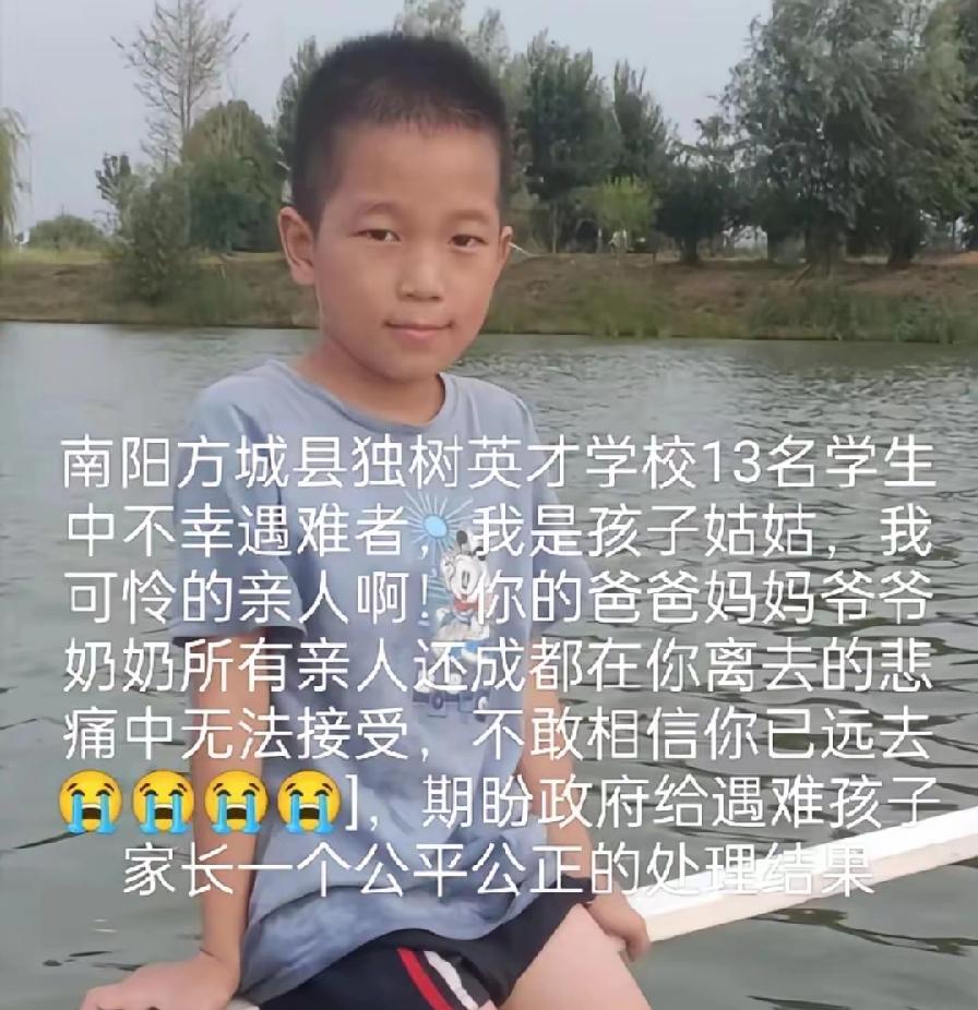 方城英才学校火灾,遇难4位小学生:1、范啸楠2、杨宜恒3、翔宇4、未知姓名,这是家属在网上发视频才曝光的,还有9位孩子,三年级平均才9岁,人生还没开始,一场火灾带走了他们年幼生命,除了家人亲戚知道,连一个名字都没有留下!事故过去近2年了,至今还没公布调查结果,范啸楠爸爸一直坚持发,背景音乐一直都是亲亲我的宝贝,让人泪目!其他家人也偶尔发视频,如今钟无艳女新闻媒体报道了,希望大家关注!当地给孩子们一个交代!