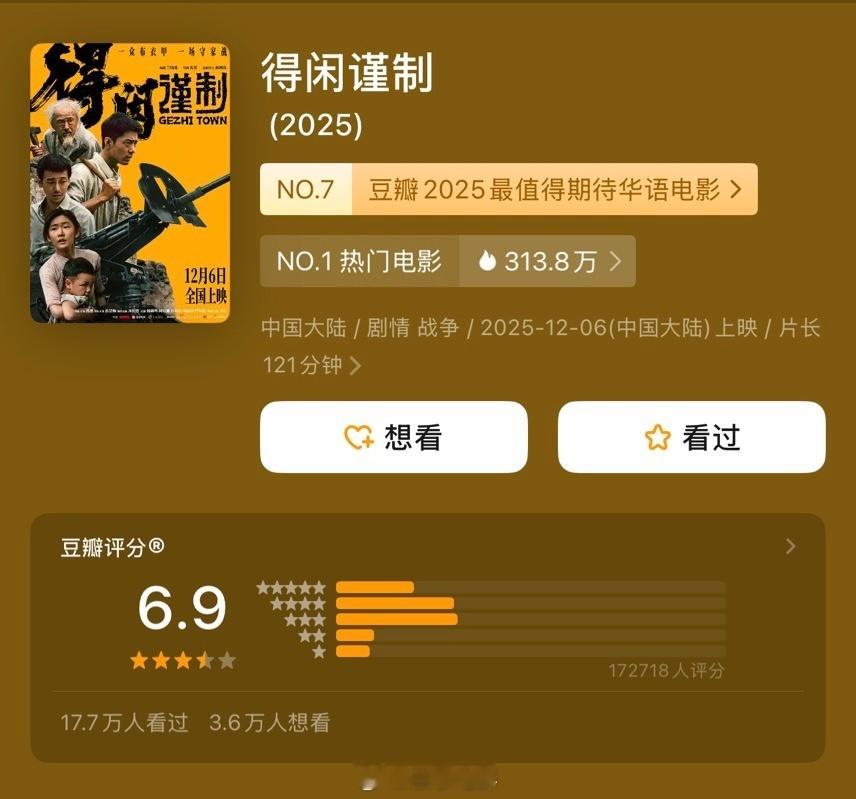 得闲谨制豆瓣开分6.9《得闲谨制》豆瓣开分6.9,我觉着分低了,我心目中的bd评分是在7.5-8之间。看过片儿的朋友,你们觉得呢?跨年电影愿