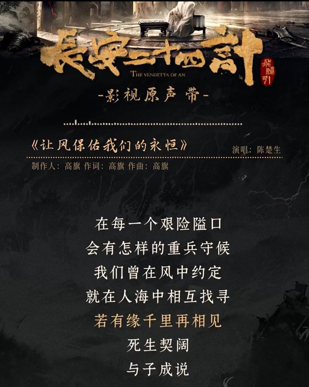 陈楚生又闷声干大事,《长安二十四计》ost来了! 歌名叫《让风保佑我们的永恒》。 又是一首好听的新歌啊。 《长安二十四计》将在央八播出,由成毅主演,一共28集。 影视原声带歌曲除了陈楚生,还有单依纯、刘宇宁和陈丽君等人演唱的。 看来这剧真的会未播先火啊。