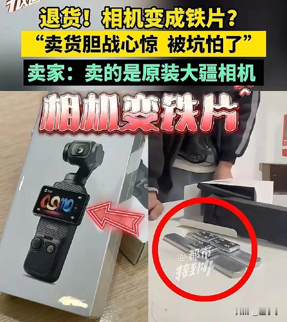 退货?相机变成铁块?河南郑州,商家出售了台相机,但买家收到货后要退货,原因是自己拍错了,可是退回来的重量不对,商家只能拒收。 张先生求助媒体时称,现在卖东西的都是卖的胆战心惊的,被坑怕了。 原来,张先生开了一家网店,专门卖电子产品,就在11月20日,一位买家下单一单大疆相机pocket 3全能版,价值在3500元。 然而,就在11月的23日,买家这边申请了退货,理由是自己买错了,包裹没有拆封,商家这边也让他发几张没有拆封的照片过来,不影响二次销售,但买家一直都没有发。 直到商家收到退回来的货,就觉得不对劲,重量不对,还有盒子上的商标也不对,商家拒绝收,就和快递小哥一起去了派出所,当着民警的面拆开。 果然,商家的担心还是验证了,盒子里面根本就不是产品,反而是两块铁块。 但,商家想要联系买家始终都无法联系,只能通过平台联系,电话是通了,对方却拒接。 如今,不仅商家这边报警了,就连揽收快递的小哥也报警了,两边都报警了,相信很快这个想要白嫖的买家就会被找出来。 此事引发了热议! 有网友表示, 贵重物品必须开箱验货才收,尤其是退货,不让开箱验货的我现在是一律不收,我也是快递员被坑怕了。 也有网友表示,卖东西的卖怕了。买东西的也买怕了,我买了一个羽绒服500元,我洗了一下那里面黑色的杂物东西还发臭味,找商家,商家也不退,各种理由就是不给你退。 商户怕被坑,买家也怕被坑,那还不如关闭所有网店,恢复实体店不就都没事了。