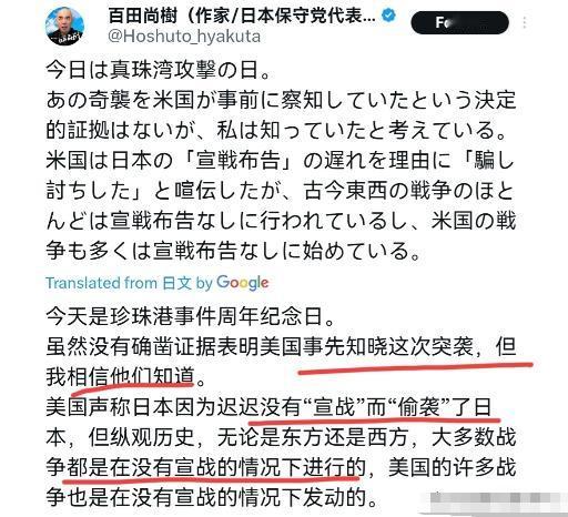 日本开始翻案了!12月8日,日本作家百田尚树公开表示,今天是珍珠港事件纪念日。虽然没有确凿证据证明美国事先察觉了那次奇袭,但我就是觉得他们早就知道了。美国拿日本“宣战公告延迟”当借口,大肆宣扬日本“不宣而战、搞偷袭”,可古今中外的战争大多是没宣战就开打,美国自己发动的战争也好多是不宣而战的。   百田尚树选在珍珠港事件84周年这一天发声,不是偶然。这个写过《永远的0》歌颂神风特攻队的作家,2014年就公开否认南京大屠杀,说那是蒋介石的“虚构”。   他的逻辑链条很清晰:既然美国在广岛长崎投下原子弹、对东京大轰炸,既然美国自己发动战争也不宣而战,那么日本偷袭珍珠港的“道德污点”就该被稀释。   这种话术,和他此前否定侵略历史的套路如出一辙——用“别人也不干净”来消解自身的罪恶。   但珍珠港的本质不是“是否宣战”的程序问题。1941年12月7日,日本6艘航母舰载机分批突袭毫无防备的美军基地,2403名美国人在周日早晨的睡梦中丧生。   即便按日本自己的记录,宣战书本应在袭击前递交,却因解码延误拖到攻击后才送达。这不是简单的“延迟”,而是精心策划的战术欺骗——选择周末发动袭击,就是算准美军戒备最松的时刻。   百田说“古今中外战争大多不宣而战”,却故意忽略:偷袭的核心是“欺骗性攻击”,而珍珠港的特殊性在于,日本一边谈判一边准备炸弹,连最后通牒都算好了时间差。   更值得注意的是百田的身份。作为日本保守党的代表,他2024年刚因“女性30岁绝育”言论道歉,转头又在历史问题上挑衅。   这种激进不是个人癫狂,而是日本右翼的集体策略:通过否定具体事件(南京大屠杀、珍珠港偷袭),逐步动摇战后国际秩序对日本的定性。   就像有人在珍珠港事件后84年突然质疑“美国是否早有察觉”,本质是想把侵略者包装成“被诱骗的一方”,为“受害者叙事”铺路。   美国的反应很微妙。2025年珍珠港纪念日,国防部的海报居然把自家TBF轰炸机和日军战机混在一起,被网民嘲讽“连凶手都不敢认”。   这种暧昧由来已久:从安倍晋三参拜靖国神社,到现任首相高市早苗的历史修正主义倾向,美国为了亚太战略,始终对日本右翼的小动作睁一只眼闭一只眼。   百田敢在此时翻案,何尝不是看准了美国的软肋?既然美国需要日本当棋子,那么否定历史的代价,自然可以被同盟利益稀释。   但历史细节不会说谎。日本偷袭珍珠港前,联合舰队花了半年模拟训练,甚至在鹿儿岛湾复制珍珠港地形。南云忠一的舰队选择北方航线隐蔽前进,避开美军侦查。   这些都写在《日本战史》里,不是“没有确凿证据”就能抹掉的。   百田所谓的“美国可能早已知情”,本质是典型的阴谋论——用无法证伪的猜测,替代铁板钉钉的事实。这种逻辑若成立,任何侵略都可以被解释为“对方早有准备”,战争责任也就不复存在。   日本国内的翻案风,从来不是孤立事件。从教科书淡化侵略,到靖国神社香火不断,再到右翼作家频繁“考证”历史,背后是一股试图摆脱战后秩序的力量。   百田的言论,不过是这股力量的冰山一角。当一个国家开始用“别人也犯错”来合理化自己的过去,当历史真相沦为政治博弈的工具,真正需要警惕的,不仅是某个作家的偏执,而是整个社会对是非曲直的模糊。   毕竟,珍珠港的废墟上,2403个生命的消逝,从来不是“宣不宣战”就能轻飘飘带过的注脚。