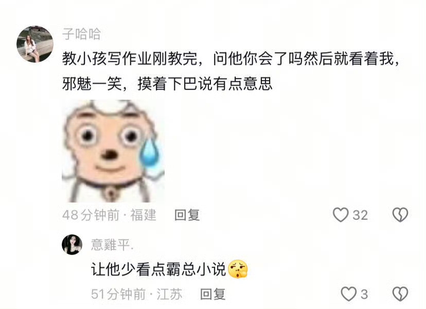 教小孩写作业刚教完,问他你会了吗,然后就看着我邪魅一笑,摸着下巴说有点意思