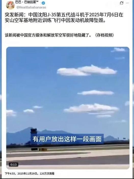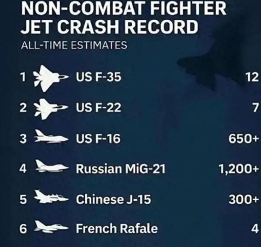 印度人造谣“歼-35坠毁”,画面一眼假,300架坠毁更是胡扯 前不久,印度一网红发布视频声称,一架歼-35战斗机在鞍山某空军基地附近飞行时因发动机故障坠毁,还宣称解放军特意隐藏了这段视频。 但说实话,这段视频都不用让专业人士来仔细甄别,就让广大网友随便瞥两眼,都能看出来这不是我们的歼-35,而是美军的F-35:且不说双发发动机和单发发动机的区别有多明显,单就论F-35那“肥肥”的姿态,跟歼-35刀锋般锐利的机身对比,差别也是一眼可见。 继续通过视频溯源和实景建筑物群对比,这架F-35的飞行地点也找到了,就是位于美国亚利桑那州的戴维斯蒙森空军基地。 这下可有点尴尬了,这名印度网红想要造谣中国战机博流量,没想到“正主”却是自己的美国大哥,算是撞到枪口上了。 还有件有意思的事:前不久有个印度人制作了一张各国战机坠毁数量海报,歼-15赫然在列,而且坠毁数量高达300多架。要知道,歼-15所有型号加起来,有没有150架还难说,印度人的嘴这么一张一合,我们就倒欠了150多架。 而在这份榜单中,阵风战机好像“表现不错”,只坠毁了4架,但这4架是怎么坠毁的,大家懂得都懂。 但换个角度来看,印度人可能是真懂坠机的,因为要论坠机经验,世界上恐怕没有哪个国家比得上印度。