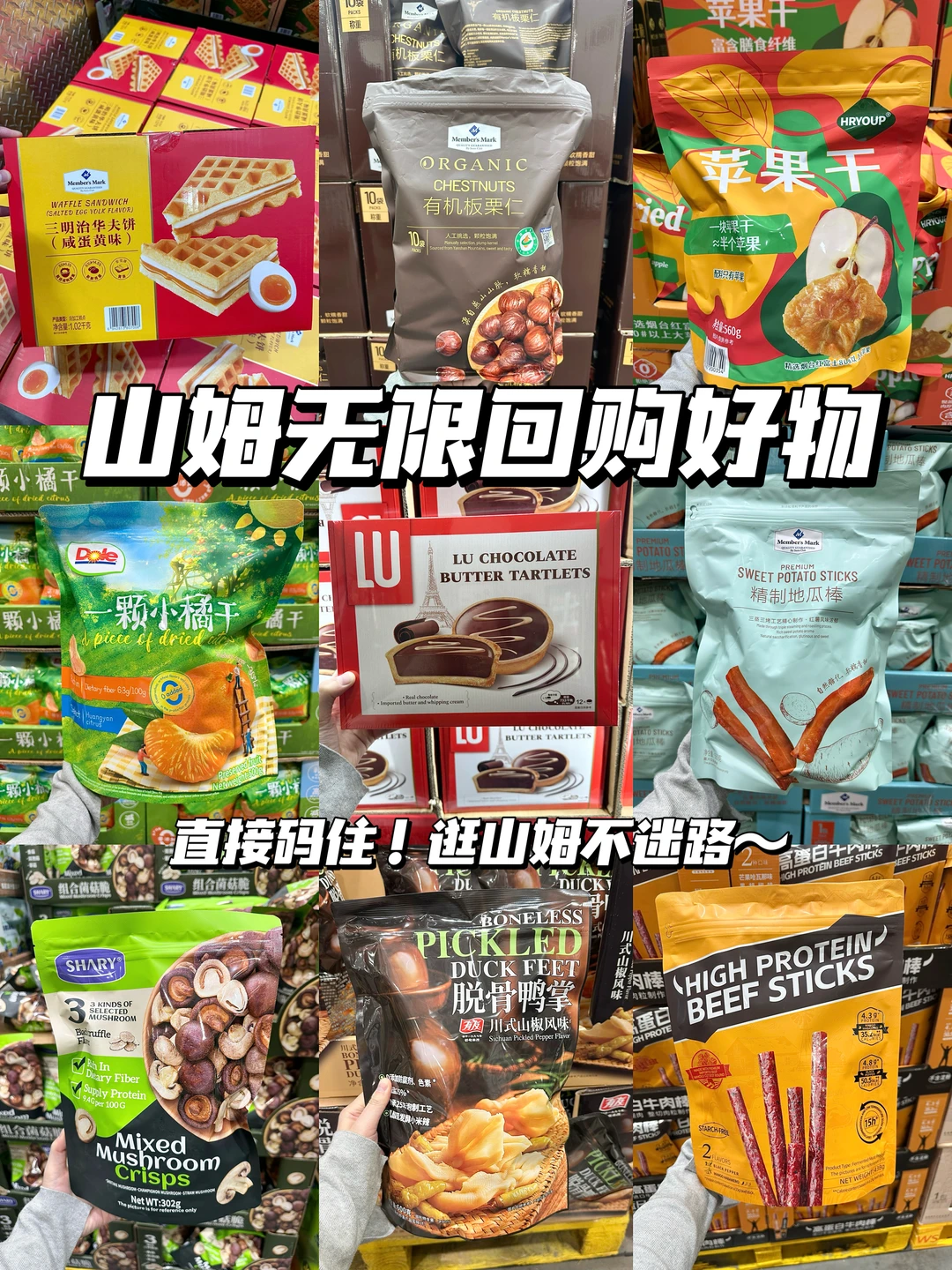 每周逛3~4次山姆,跟着我逛山姆不踩雷,这些都是我追剧必囤的,评论区分享给我更多好吃的吧,我会持续更新! ✅三明治华夫饼 独立小包装超方便,巴掌大一个刚好解馋~ 外层面饼松软带点嚼劲,中间咸蛋黄酱夹心超浓郁!咸香绵密不腻口,沙沙的口感太绝了 ✅有机板栗仁 无额外添加!纯有机板栗超绝~ 粉糯香甜不粘牙,每颗都饱满扎实! 独立小包装便携,追剧、解馋、当下午茶都可! ✅露怡巧克力黄油挞 重点夸夸这款巧克力黄油挞直接封神😭 酥到掉渣的黄油挞皮也太香了吧!咬一口咔嚓响,黄油味超浓郁~ 黑巧内馅,口感丝滑没那么甜,过后嘴里留着清甜,味道特别香浓~ 料给得超足,每口都是厚实的满足感✨ 冷冻直接吃像生巧慕斯,性价比绝 红白简约包装颜值在线! 还能DIY奶盖版!加奶茶小料随便拌拌,颜值口感双升级,拍照发圈绝了! ✅苹果干 无额外蔗糖,纯苹果本味超清爽~ 配料表只有苹果,富含膳食纤维 果肉厚实有嚼劲,不干不柴!真的很好吃! ✅一颗小橘干 入口就是新鲜橘子那种清甜带点微酸 果肉饱满有嚼劲,酸甜多汁不粘牙,越嚼越香! 独立包装!走哪带哪! ✅地瓜干 配料表只有地瓜干,纯纯地瓜本味清甜~ 软糯有嚼劲还不粘牙,每根都厚实饱满! 独立小包装超方便,减脂期也能放心炫 ✅组合菌菇脆 打开就能闻到黑松露香味 外面裹着一层料 脆脆的了咸香中带一点回甜! ✅脱骨鸭掌 无限回购的脱骨鸭掌,川式山椒味真的太顶了,酸酸辣辣很开胃! ✅高蛋白牛肉棒 纯肉实打实!高蛋白低脂肪, 吃着也没负罪感感~ 黑椒香微辣超正,芒果哈瓦那清新带辣 -