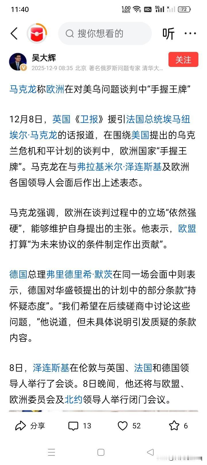 欧洲手握着王牌? 欧洲在美国关于解决乌克兰战争的问题中,好像手里握着王牌。这是法国总统马克龙,与英国首相斯塔默.德国总理默茨一起在唐宁街10号英国首相府与乌克兰总统泽连斯基进行了较长时间会谈后表示的。 但欧洲握着的王牌具体究竟是什么,马克龙却没有明说。美国停止对乌克兰的各种援助后,欧洲继续并掏更多的钱援助乌克兰,这是明摆着的事情。这种情况,大概很可能根本就算不上什么手里握着的王牌。那么,什么才是欧洲手里握着的王牌?综合推段,估计马克龙就是指乌克兰总统泽连斯基,或者乌克兰这个国家的态度和立场。因为无论任何结束战争的和平协议,都必须由乌克兰认可和同意,否则就不可能达成任何停战的和平协议,而且,无论谁拟订的和平协议,都是一张废纸。 因此,大可猜测,估计很有可能,泽连斯基私底下向欧洲的大国作出承诺,如果没有他们点头,乌克兰大约不会承认和签署什么和平协议。