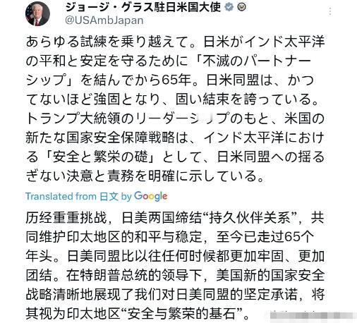美国出来表态了!在中日发生所谓的雷达照射日本战机一事之后,12月8日,美国驻日本大使声称,历经重重挑战,日美两国缔结“持久伙伴关系”,共同维护印太地区的和平与稳定,至今已走过65个年头。日美同盟比以往任何时候都更加牢固、更加团结。 以往但凡涉及亚太安全,华盛顿总爱把“中国因素”挂在嘴边,甚至直接当靶子树起来。可这次驻日大使说了六分钟同盟史,从冷战聊到印太,愣是没提“中国”两个字。这不是偶然,是特朗普班子悄悄改了剧本。   先看刚出炉的国家安全战略报告,白纸黑字写着“核心利益优先”。啥是核心?拉美后院不能乱,国内铁锈带要振兴,中东的永久战争得刹车。   亚太呢?报告里用了个新词叫“可控竞争”——既不想丢主导权,又怕被盟友绑上战车。就像去年在委内瑞拉边境搞军演,宁可把航母开过去,也不愿在东海跟中国硬碰硬。   日本大概没想到,自己精心准备的“中国威胁论”剧本,美方突然不接戏了。回想奥巴马时代,钓鱼岛适用安保条约的声明直接写进联合公报,生怕中国看不懂。   现在呢?特朗普班子算的是另一本账:驻日美军每年要日本掏200亿,可东京在南海巡航、台海问题上的“配合”,远远够不上这个价码。与其跟着日本在东亚火中取栗,不如让东京自己当“区域责任承担者”。   更深层的变化在美军的全球部署图上。关岛的轰炸机轮换停了,横须贺的航母检修周期变长了,反倒是加勒比海搞了30年来最大规模军演。   这种收缩不是示弱,是算清了账——东亚的军事存在每增加1%,拉美后院的失控风险就涨3%。白宫幕僚长私下说过,“不能让东京觉得美国永远会为钓鱼岛流血”。   还有经济账。去年日本对美贸易顺差680亿,汽车关税谈判卡了大半年。特朗普要的是“对等”:你享受安保保护,就得买我的天然气,开放农产品市场。   这次表态回避中国,某种程度也是敲打日本——同盟不是免费的,先把经贸账算清楚,再谈安全承诺。   当然,美国没明说中国,不等于放松警惕。新国防预算里,关岛反导系统追加了15亿,太空军在印太的监测站多了三个。   这种“隐性威慑”比公开叫阵更务实:既能安抚日本,又给中美留了缓冲。就像报告里写的,“避免地区冲突升级为大陆战争”,说白了,不想替盟友的激进政策买单。   最有意思的是对欧洲的态度。报告罕见批评欧盟“文明消亡”,却对东亚盟友网开一面。这不是偏爱,是看透了日本的局限性——一个连远程导弹都不能自主研发的国家,再怎么军事化,也成不了美国的“平等伙伴”。   与其激化矛盾,不如让东京在“有事时”多分摊成本,比如去年日本自卫队承担了驻日美军70%的基地劳务费。   这种转变,根子在特朗普的“美国优先”逻辑。以前美国当世界警察,现在要当“选择性介入的利益收割者”。   就像处理乌克兰危机,一边喊停火,一边卖武器给欧盟。在东亚,同样希望日本当“前沿哨兵”,自己只提供“核保护伞”这种低成本威慑。毕竟,派航母过去要烧油,派外交官过去只需要说话。   日本可能没看懂,这次美国的“沉默”,藏着更深的算计。当华盛顿把拉美、能源、制造业列为核心利益,亚太的优先级自然下降。   就像去年撤走中东一半驻军时说的,“不能让次要地区拖垮核心竞争力”。中日摩擦这种级别的事件,现在更像是“盟友该自己处理的麻烦”。   最后回到那个老问题:美国真的还能号令亚太吗?从这次表态看,华盛顿更愿意当“离岸平衡手”,而不是直接下场。   就像报告里反复强调的“让盟友承担主要防务”,本质是承认美国的全球扩张到头了。不提中国,不是忽视,而是要用更小的代价,维持对东亚的影响力——毕竟,沉默有时候比喧嚣更有威慑力。