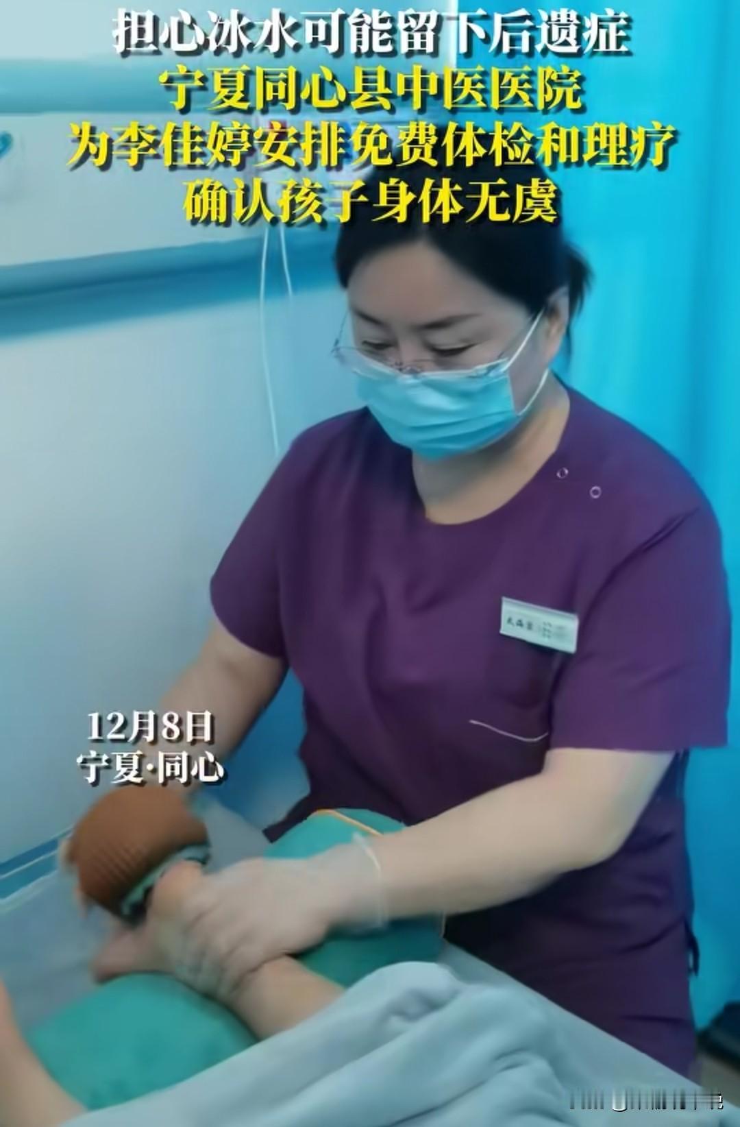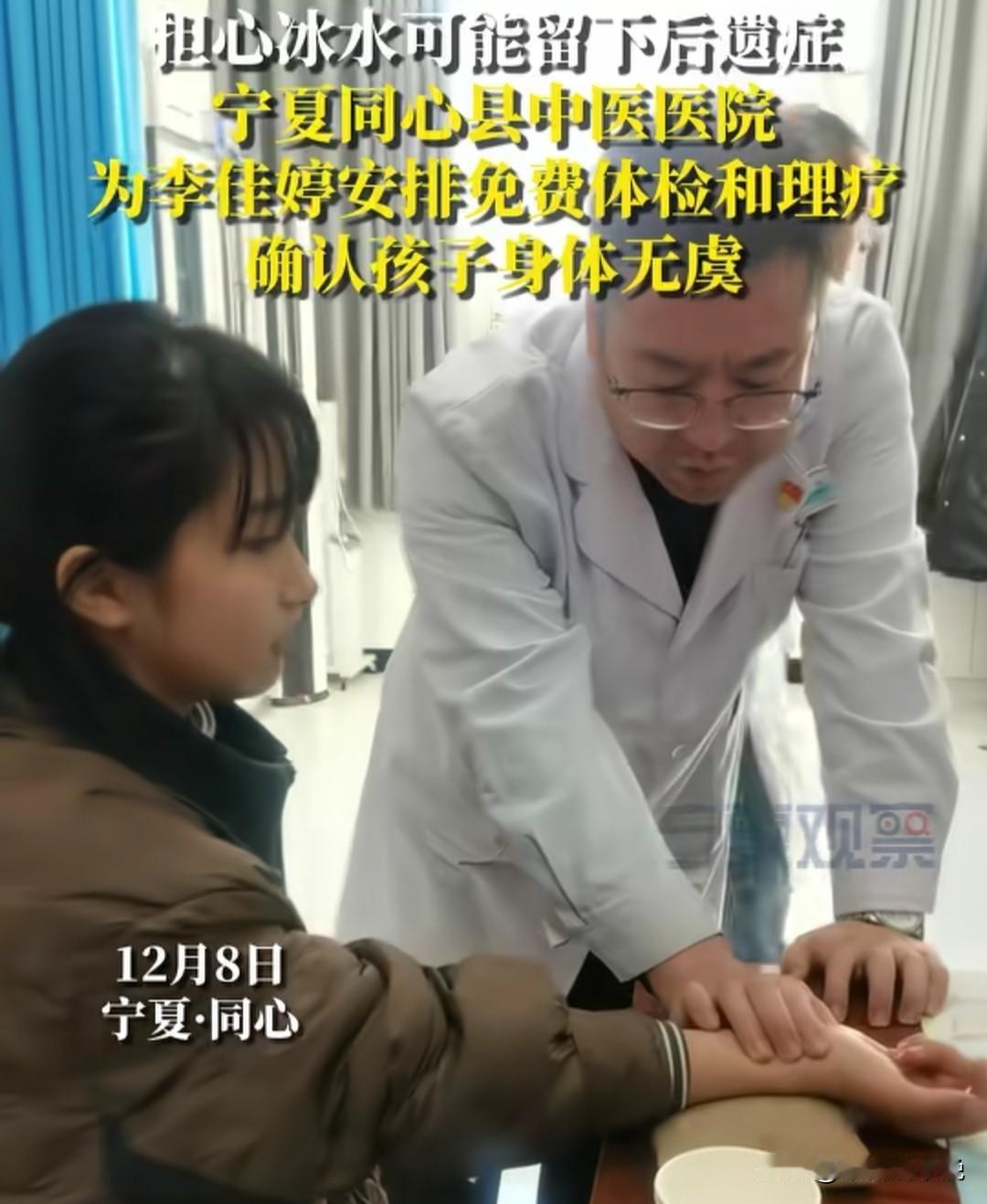 担心冰水可能留下后遗症 李佳婷同学还是去到了医院 同心县中医院高院长说李佳婷同学受的寒气,医院可以通过内服中药,外用中医拔罐、艾灸、药浴来把寒气逼出来! 最终通过体检和理疗,确认李佳婷同学的身体无虞!毕竟只有13岁的小女生,大冬天的泡在冰窟窿里,怎么能让人放心呢?这下大家悬着的心总算可以落下了!