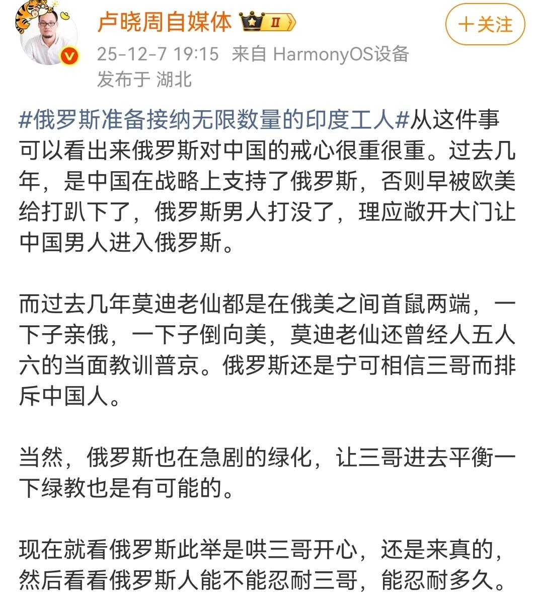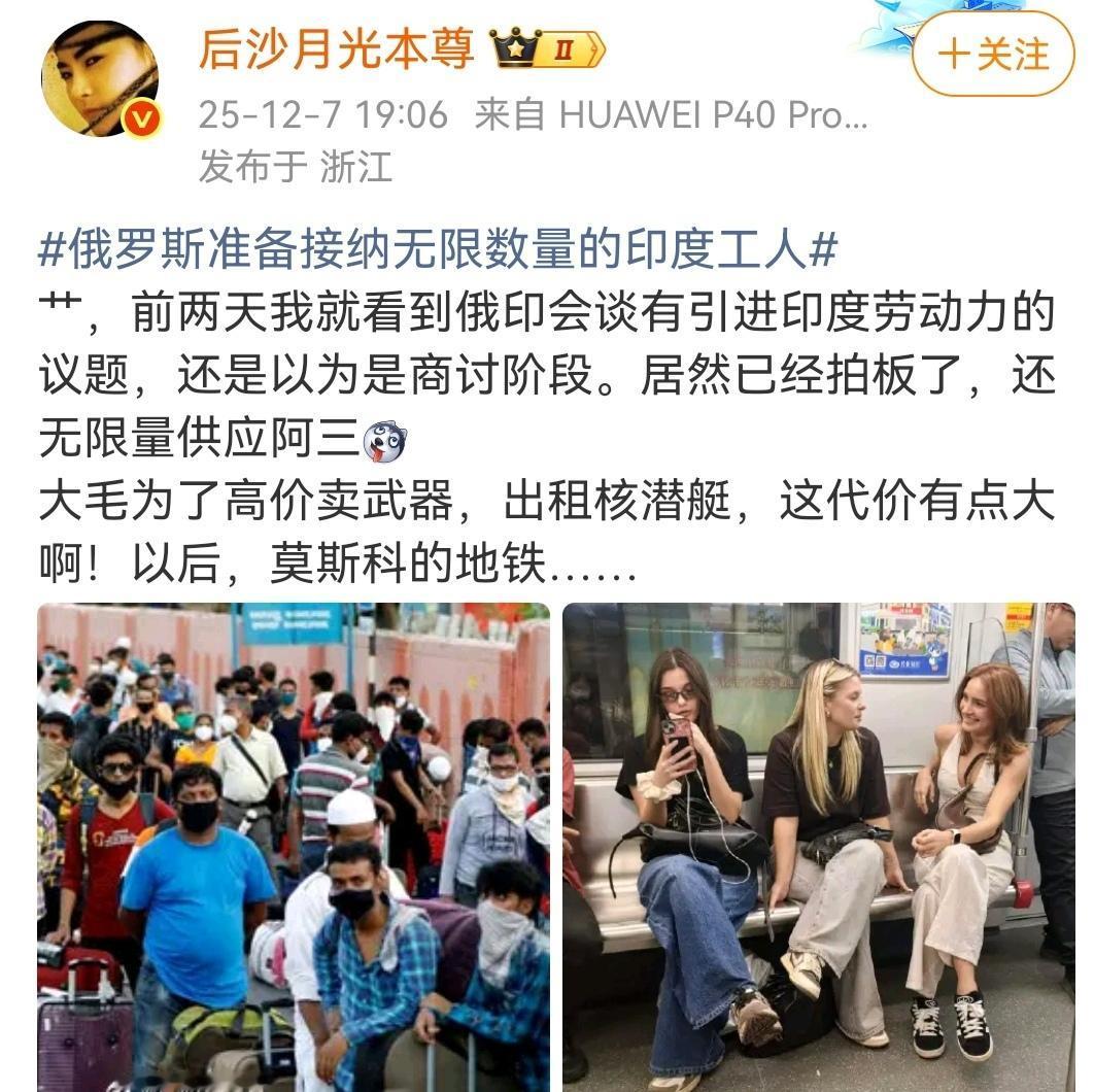 各取所需,俄罗斯计划引入无上限印度劳工。 (如图所示)俄罗斯总统普京访印后不久,俄就宣布开放印度技术工人赴俄工作,引入的人数有80万或150万,更有俄副总理的无上限的说法。作为世界国土面积最大的俄罗斯,和人口最多的印度,印用人力资源可以换取俄的武器和石油,双方各取所需。