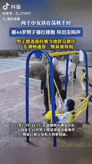 太恶劣了!广东,两名小女孩正在荡秋千,一位44岁男子突然走过来强行搂抱其中一名小女孩,小女孩吓得一边尖叫一边挣扎,另一小女孩见状,果断出手打断男子动作,男子见事情败露想逃之夭夭,最终被围上来的群众抓住,并被警察刑拘。 (来源:海外观察) 12月5日,广东潮州彩塘镇一公园里,两名身穿校服的小女孩正开心地坐在一起荡着秋千。这时,突然走过来一名中年男子,看样子是想要坐在秋千上。 这就奇怪了,秋千已经有人在荡了,你一个陌生男子坐上来凑什么热闹呢,这难道没有不可告人的目的吗? 左边的一位小女孩见有陌生人来坐,十分警惕,赶紧提醒同伴离开,没想到,自己刚刚起身离开秋千,离男子近的同伴却没来得及逃离,被男子给死死抱住了。 同伴吓坏了,一边连声尖叫拒绝:“啊,不要,不要......”,一边奋力挣扎试图挣脱男子的束缚,但男子仍旧坐在秋千上,两只手死死圈住小女孩的脖颈不放手。 关键时刻,刚刚起身的那位小女孩没有丝毫害怕,也没有选择离开,而是勇敢上前,冷静且果断地拍打男子的手臂,男子吃痛,这才松开了手。 还有就是小女孩的那一份镇定,令男子害怕了。 不得不说,这男子真是胆大妄为,大庭广众之下,也敢公然骚扰小女孩。而他见事情败露便想逃之夭夭,却被群众给合力围堵、合力擒凶了,还被警察刑拘。 网友们对此,议论纷纷。有网友说,这种变态男只有挂上墙上才会老实,必须严惩! 有网友说,多亏这位小闺蜜敢出手,有些小孩是不敢出手制止的,她真的很勇敢,值得深交。 还有网友说,这还是在大白天,还是人多的公园,不敢想还有多少坏蛋躲在阴暗角落里偷偷做坏事呢。 男子的恶劣行为,无疑是对孩童纯真的亵渎,更是对公共安全底线的公然践踏,被刑拘也是罪有应得! 另一名小女孩的果断出手,就像黑暗中的一束微光,面对风险她没有退缩而是勇敢制止,这份超越年龄的冷静与正义,既保护了同伴,也唤醒了群众的责任意识。 愿每一个孩子都能在阳光下安心嬉戏,同时警告那些妄图骚扰女性的人: 莫伸“咸猪手”,伸手必被捉!