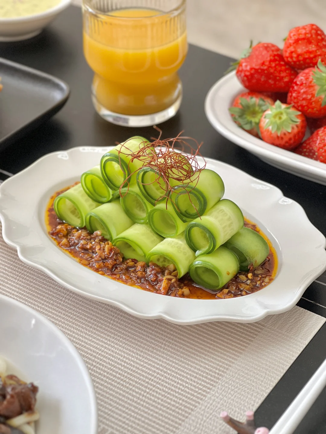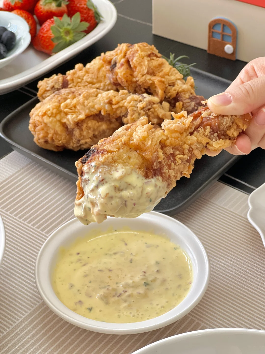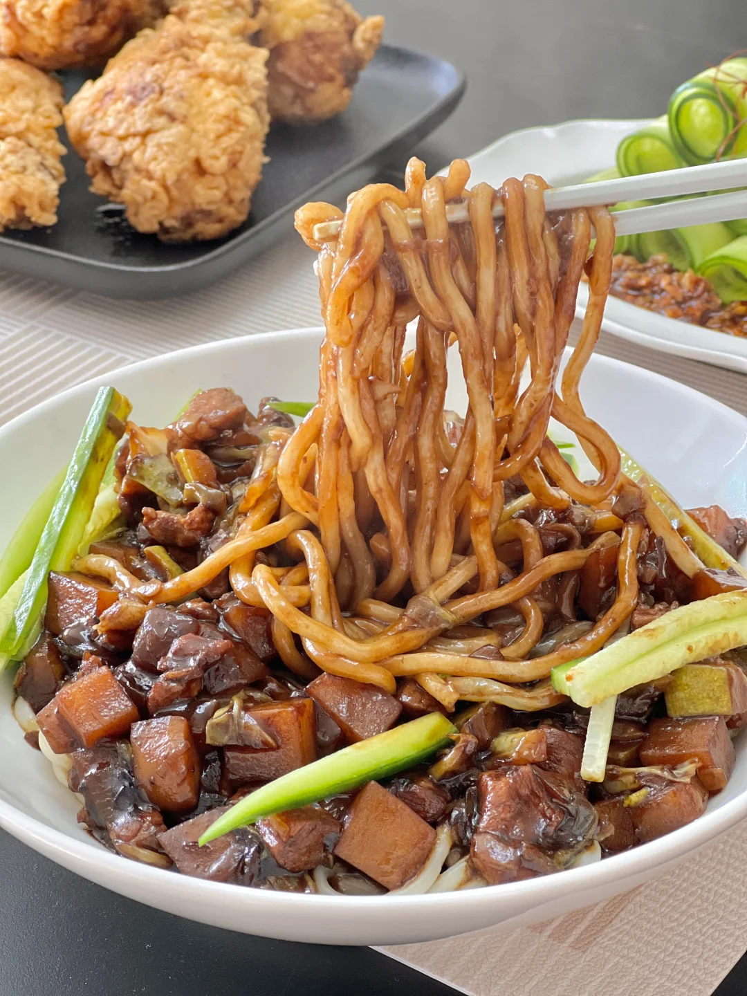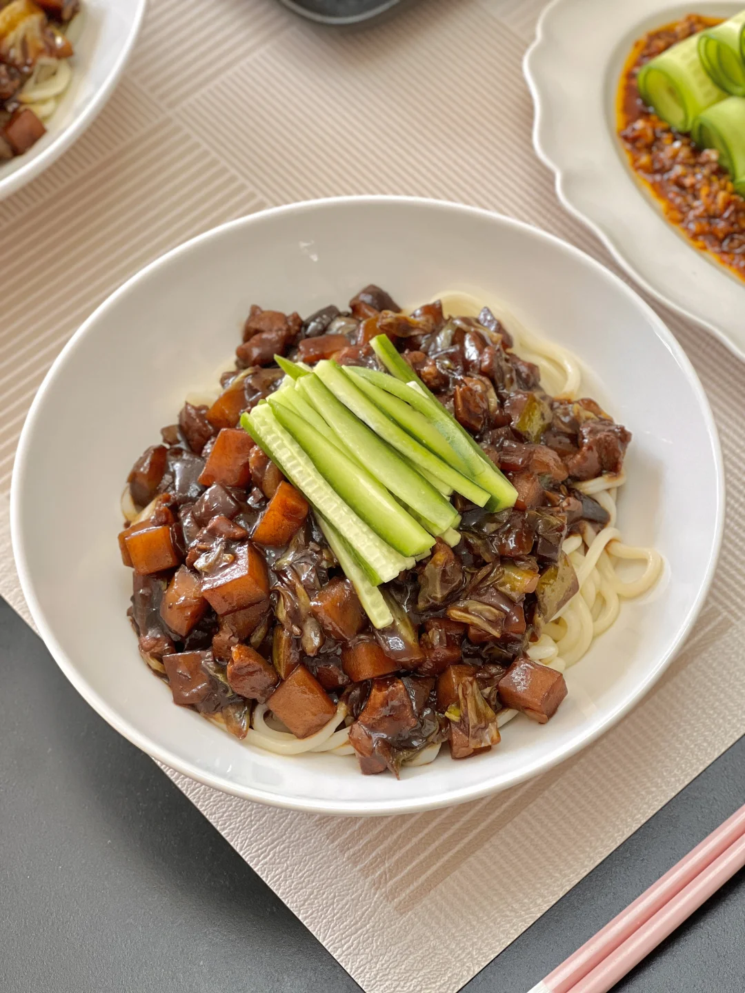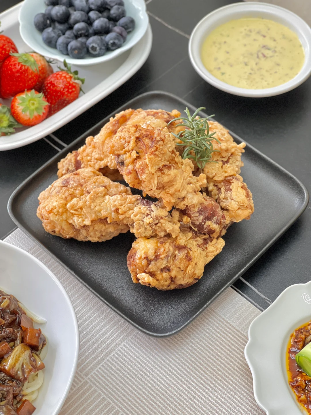 今天的面虽然看起来有点黑黑的,但是味道很不错哦~炸酱裹着面条一起,酱香味十足,自己做的也不会太咸,黏黏糊糊好好吃[派对R]炸鸡我是有点小心得了,加牛奶泡够时间后,炸出来特别香和多汁,可以去学校门口开炸鸡店了[暗中观察R] 【延吉炸酱面】 【酸奶酱炸鸡】 【凉拌黄瓜】