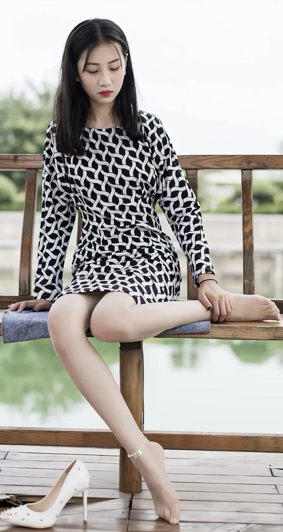 这套穿搭是简约高级的黑白几何轻熟风,利落又带精致细节。黑白链条纹连衣裙自带复古几何质感,修身版型凸显身形曲线,长袖设计适配温和天气,简约中透着优雅;短裙摆则增添了轻熟灵动的气质。 搭配白色铆钉高跟鞋精致亮眼,与连衣裙的黑白调形成呼应,提升了造型的精致度。黑白连衣裙 连衣裙 黑白极简连衣裙