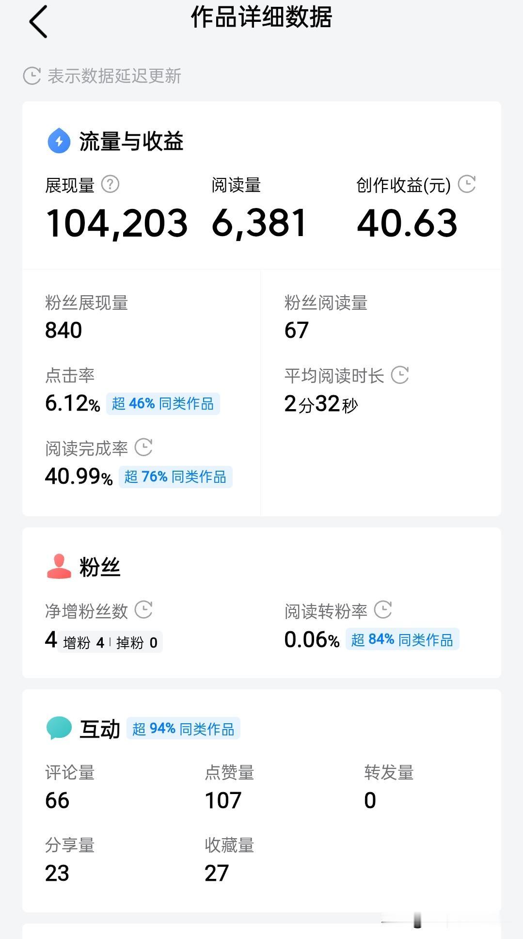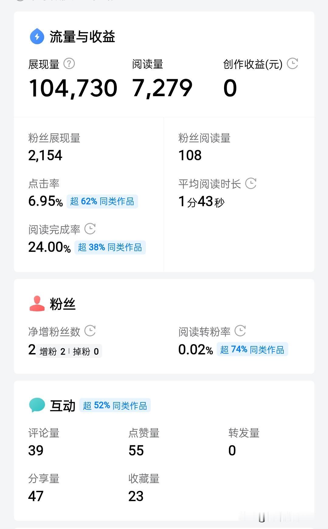 最近我遇到一件特别懵的事,搁在心里好几天了,实在想不通,想跟大家请教请教。 平常很少写文章,因为我写文章几乎没有阅读量,就前几天,我看到有网友说文章单价高,我就在头条发了两篇自己写的文章。第一篇,看着有七千多人读过,结果后台的收益,一分钱都没涨,显示是零。我寻思,是不是哪里弄错了?转头又发了一篇。第二篇,六千多的阅读量,这次居然有了四十多块的收益。 这下我可彻底糊涂了。这平台的账,到底是咋算的? 不是说光看阅读量就给钱吗?怎么一个七千多阅读零收入,一个六千多反倒有钱呢?难道这“阅读量”里头,还有什么别的门道? 我仔细翻了翻后台,看到一个词叫“获利阅读量”,还有一个叫“互动系数”。这俩是啥意思?是不是说,光有人点开看还不够,得有人真正看完、评论、收藏,这阅读才算“值钱”? 那我第一篇是不是大家点开就划走了,如果说,点开就划走了也不可能,可平均阅读时间也有一分半呢?就是想不通啊!而第二篇可能恰好说到了大家想讨论的点,留言、点赞多了,收益就上去了? 另外,我听说如果勾选了“头条首发”,也可能有额外的补贴。这个“首发”的补贴,跟阅读量又是怎么一起算进总收益里的呢? 越想问题越多。平台肯定有自己的算法,但这具体怎么个算法,对我们这些刚摸索着写东西的人来说,真像一道猜不透的谜题。一篇内容的“价值”,到底是怎么被衡量和定价的? 有哪位对这里头规则比较明白的朋友吗?能不能给我点拨一下?到底是阅读的“质量”(比如互动)、内容的独家性,还是别的什么因素,在真正决定收益的高低?实在是被这“同量不同价”搞得没方向了,先谢谢大家! 爆料