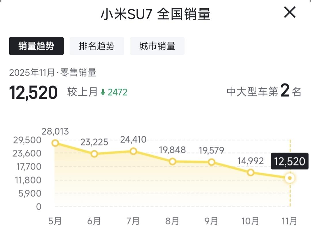 啥情况,小米SU7销量连续下滑,是不是该降价了? 11月份,小米SU7卖了12520辆,销量连续6个月走低,对比今年5月份的28013辆,已经跌去一大半了。 是被YU7挤占了产能,导致产量上不来,还是因为风评变差,消费者不买单了? 同级别的新能源车,其实能打的没几个,小鹏P7、极氪001、比亚迪汉L、阿维塔12,对小米SU7都构不成威胁。 小米SU7竞争力足够强大,但是为什么销量在持续走低? 销量起不来,是不是该降价了?