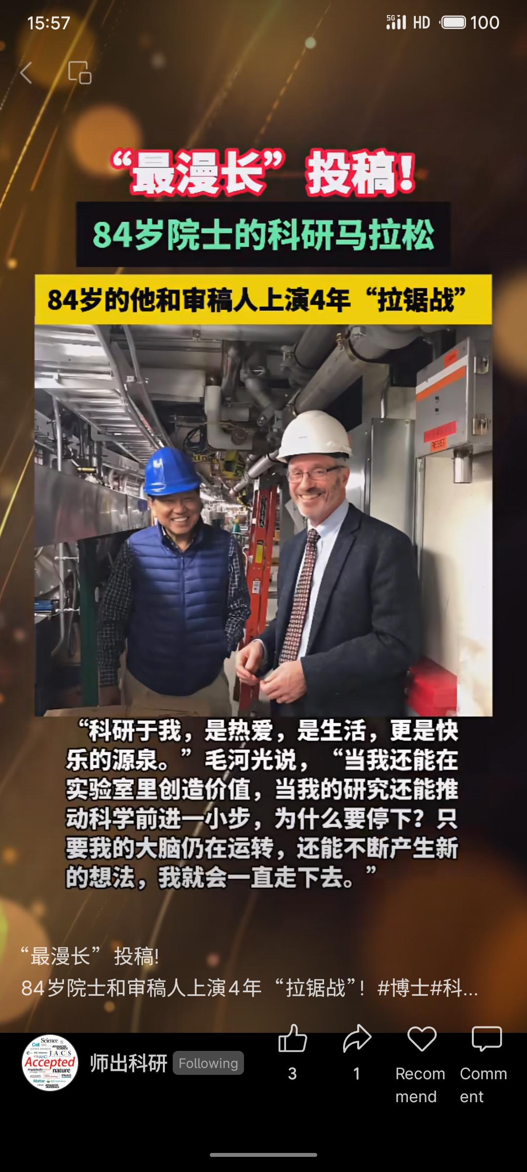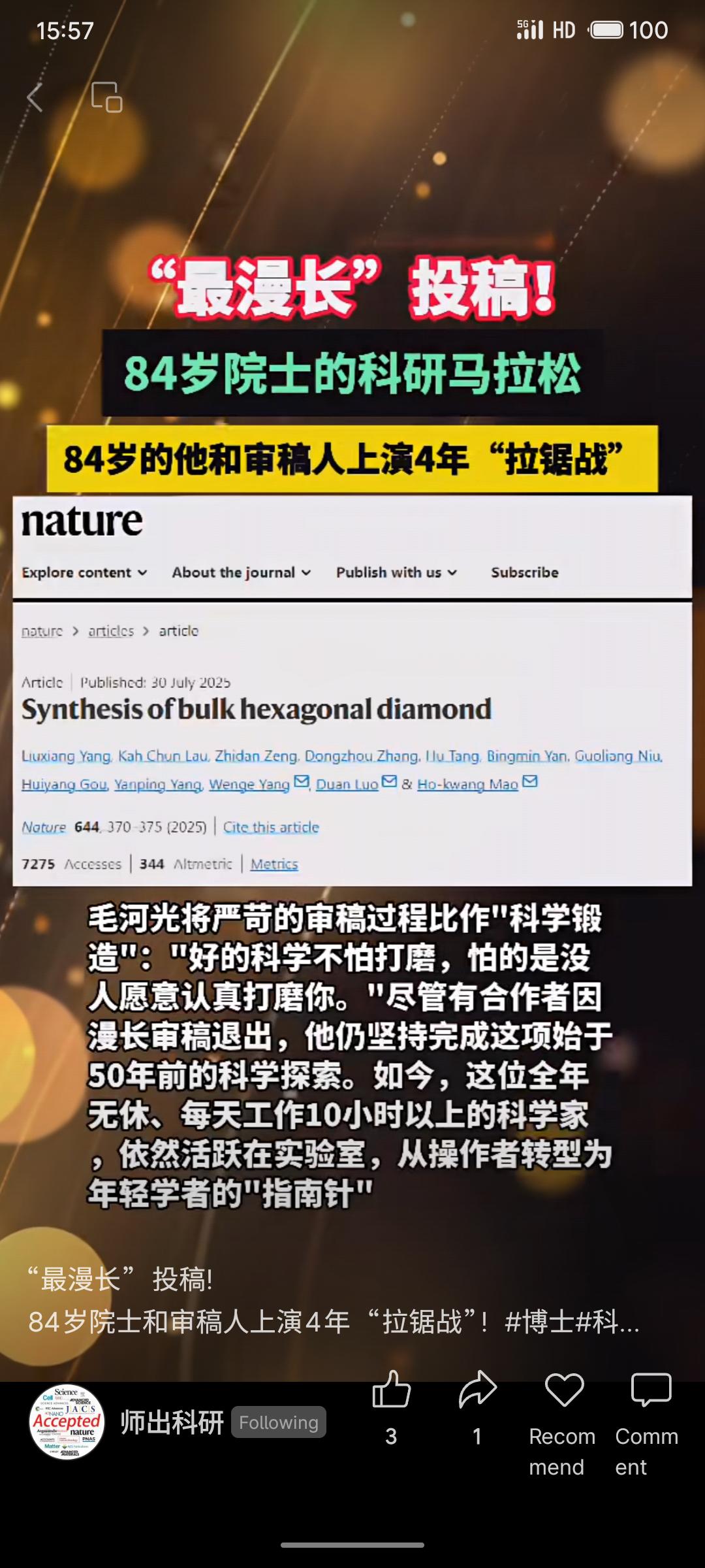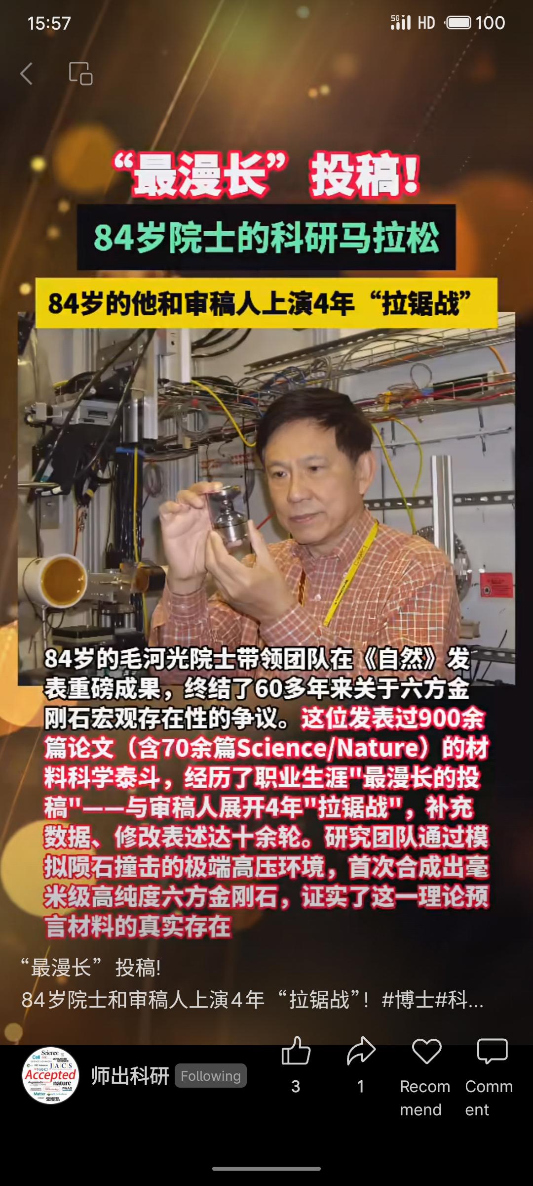 84岁院士毛河光团队历经四年审稿“拉锯战”,终在《自然》发表重大成果,首次合成毫米级六方金刚石,终结其宏观存在性长达60余年的科学争议。毛院士以“科学锻造”自喻,展现老一辈科学家对科研的极致坚守与热爱。这项始于半个世纪前的探索,不仅推动材料科学前进,更传递出“好的科学不怕打磨”的执着精神,激励后辈在漫长征途上保持探索的热忱与耐力。