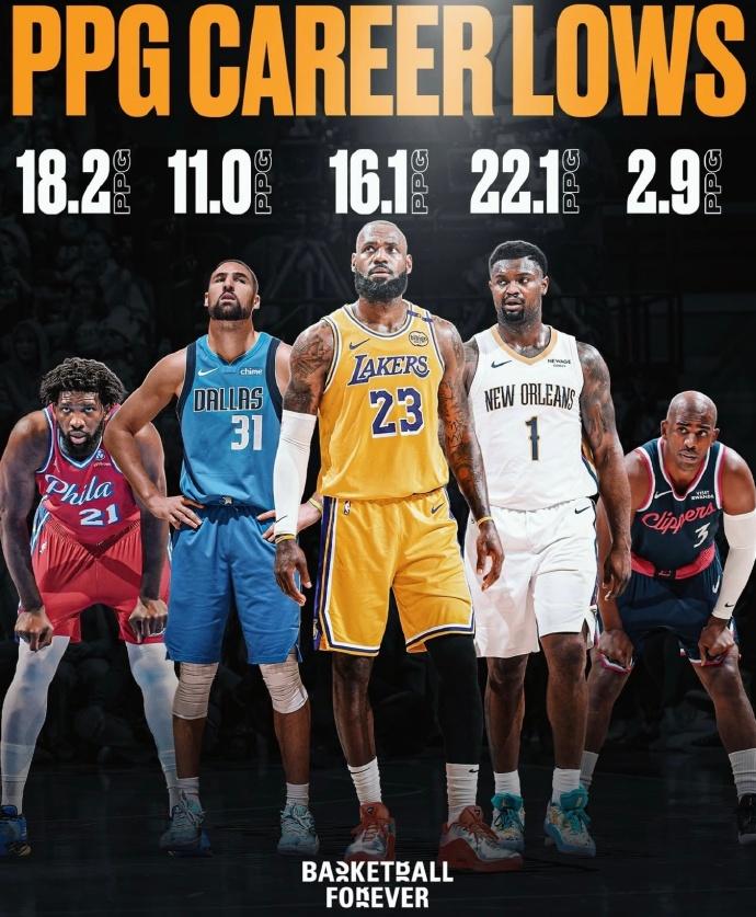 詹姆斯场均16.1分,生涯最低 恩比德场均18.2分,生涯最低 汤普森场均11分,生涯最低 锡安场均22.1分,生涯最低 保罗场均2.9分,生涯最低 詹姆斯、保罗、克莱这几个都是生涯末期了,得分生涯最低能够理解,而恩比德和锡安,就纯属被伤病折磨后的陨落。 恩比德在几年前还是MVP,常规赛战斗力与约基奇比肩,结果现在复出后,打法已经完全失去对抗了,刚刚在对阵湖人的比赛里,关键时刻背打里夫斯,上演了一出翻身后仰打铁的闹剧,让很多人看的瞠目结舌。 而锡安,是纯废了! 生涯至今,打了227场比赛,缺席了270场,大合同一拿,休息的时候居多,本赛季才开始一个多月,他已经历经了3中不同的伤病,鹈鹕管理层思之绝望,已经有风声要把锡安摆上货架,他们实在遭不住了。