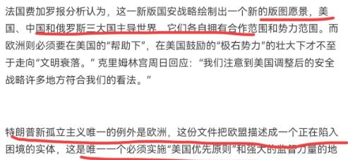 法媒感到非常沮丧!法媒表示,美国变了!美国追求的是与中国、俄罗斯等大国共同主导世界,而欧洲则被晾在了一边。 12月9日,法新社刊文表示,美国刚刚公布的国家安全战略文件尖锐批评了盟友欧盟的政策,书面文件上把矛头对准欧洲,而非中俄。法媒表示,美国的新战略从今以后放弃了全球观,而将全球置于几大势力范围之内,每个大国在其势力范围内负责各自的利益,美国不干涉其内政。 美国此次政策收缩让欧洲人措手不及。过去,美国的战略几乎都盯着中国和俄罗斯,把欧洲当同一阵线的伙伴,而现在,美国自己改了剧本,公开承认世界将由几个大国分摊势力范围,不再想把全球事务全揽在手,欧洲就这样被推到边缘地带。 在新版战略设计中,美国、中国、俄罗斯分别主导各自区域的事务,中国和俄罗斯不再被列为“首要威胁”,而是被视作不可忽视的权力中心。 这种变化在法国媒体看来很刺眼,因为曾经很长一段时间,美国宁愿付出成本,也要维系“盟友团结”的形象,如今却选择和中俄维持某种平衡,留欧洲在一边凉着。 仔细想下,美国这样调整不是为了放弃大国地位,而是算盘更精了,全球到处管需要大量资源,而美国自身经济负担不轻,国内问题复杂,它不想继续为别人花大钱。 对它来说,欧洲的安全依赖已经变成包袱,眼下不想再让欧洲搭便车,与其到处点火、处处插手,不如集中精力看住自己的后院,把资源用在能直接带来收益的地方。 美国把西半球视为自己的核心势力范围,不愿在边远地区耗费力气。淡化与中俄的摩擦,是因为硬拼代价太高,现实逼着美国接受多极化的格局,它只是把霸权做了“瘦身”,减少战线,让自己更能维持现有的优势地位。 对于欧洲来说,这是一记重拳。长期依赖美国的防务,现在突然被冷处理,打破了它的安全幻想,失望之外,欧洲也不得不面对一个事实——如果不能在安全和战略上自立,就只能跟在别人后面走。 在这种情况下,摆脱对美国的依赖,也许反而能让它找到一条更有自主权的道路。 这场战略转向,对中国的意义更为积极。中国的经济和综合国力让美国不得不承认我们的存在,并且在大国博弈中将我们视为决策的重要一方。 我们面对的是一个更公开的力量格局,不必在美国旧式的压制中被动应对,而是可以在新秩序中以平等身份参与制定规则。 美国的变化,本质是实力减弱后的权衡,既要减少开支,又想保住霸权,它愿意与中俄共存,不是因为心甘情愿,而是无力再发动全面对抗。这是国际力量平衡改变的结果,也意味着单极世界的终结。美国会继续维护自己的利益,只是欧洲再也不在它的优先列表中。