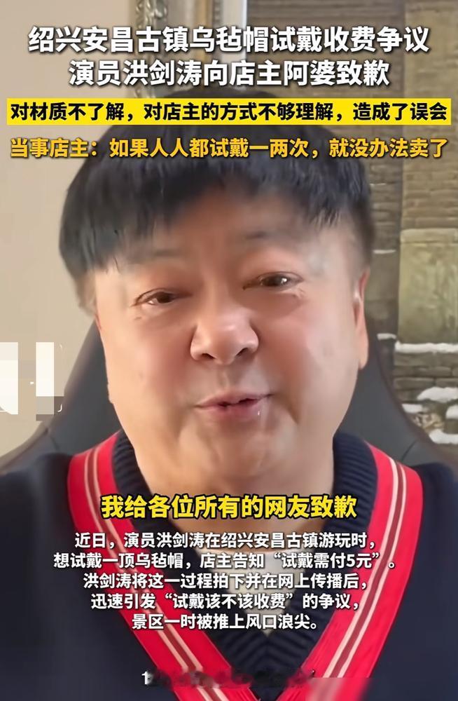 洪剑涛并没做错什么, 没必要道歉。 买帽子试戴一下就要5块钱,这事放在谁身上都会觉得是旅游景点“坑人”。 洪剑涛的感受,代表了千千万万普通游客最真实的第一反应。 话说回来,商家施奶奶的解释听起来在理,羊毛材质娇贵,头油汗渍确实难清理。 但做生意,讲究的不就是个你情我愿、明明白白? 若真如此,一块醒目的提示牌,成本不过几块钱,就能避免绝大多数误会。 为何偏要等顾客伸手了,才口头告知这额外的“试戴费”? 这种事后才亮出的规则,难免让人心生“挖坑”之感。 古镇里另一家店大大方方免费试戴,生意也没见因此做不下去,这其中的经营智慧,高下立判。 洪剑涛把视频发出来,绝不是抠门到舍不得那五块钱。 他较真的是这份消费体验里的“不公”与“暗礁”。 公众人物的影响力,在此刻成了放大镜,照出了旅游市场中那些早已见怪不怪的潜规则。 普通人遇到类似情况,大多选择沉默,不是不委屈,而是维权成本太高,耗不起那个时间精力。 正是这一次次的沉默,反而纵容了某些不合理现象的滋生。 安昌古镇管理方的反应算得上迅速,增设免费试戴点、要求明码标价,这些举措值得肯定。 但这阵风过去之后呢? 全中国成千上万的景区里,还有多少类似的“试戴费”、“触摸费”、“问价费”藏在角落? 这次事件是一面镜子,照见的不仅是安昌,更是整个旅游业服务意识的短板。 服务的温度,恰恰体现在对这些细节的用心打磨上,而不是把经营风险变着法儿转嫁给游客。 说到底,游客要的从来不只是便宜,是一份被尊重的、明码标价的舒心。 一顶乌毡帽,本是承载水乡风情的文化符号,不该异化成一次算计与反算计的博弈。 洪剑涛的“随手一拍”,撕开了一道口子。 希望这股推力,能真正让我们的旅游环境变得更透明、更友善。 毕竟,谁出门玩都不是为了找气受,那份轻松愉悦的心情,千金不换。