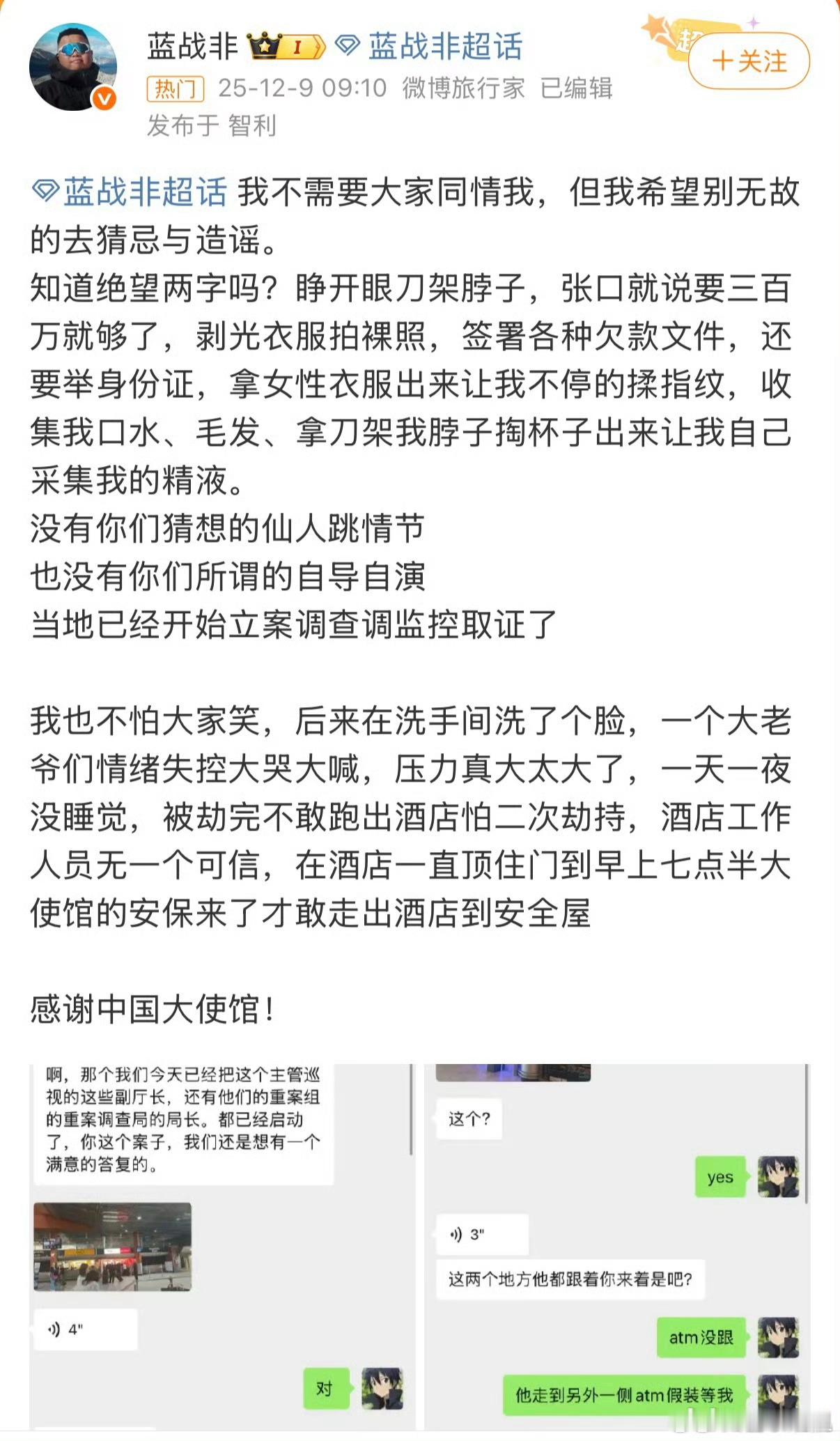 蓝战非称被强迫拍裸照看了半天蓝战非被绑架的视频,真的感同身受,我记得有个朋友,以前在英国上体育大学,有次去巴塞罗那看足球赛,结果晚上球赛结束,两方球迷在场外大打出手,她跟她同学吓的只能躲在角落,等到深夜才敢出去出过几次国才能发现国内的安全性有多夸张,而且每次出国前,一定要尽可能找到当地靠谱的人,不然对任何人都要保持警惕蓝战非被绑架警方已立案