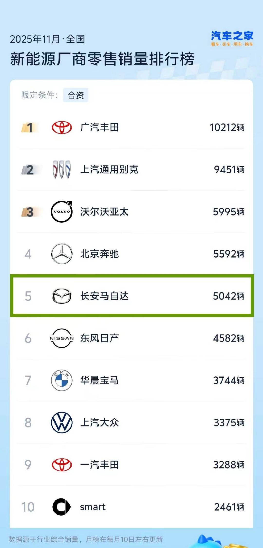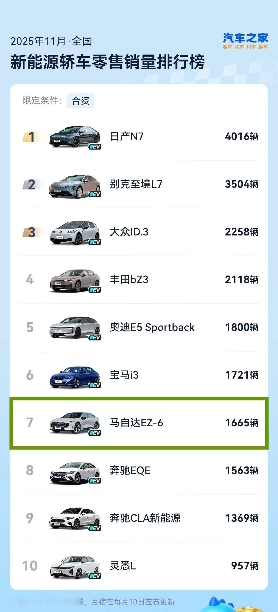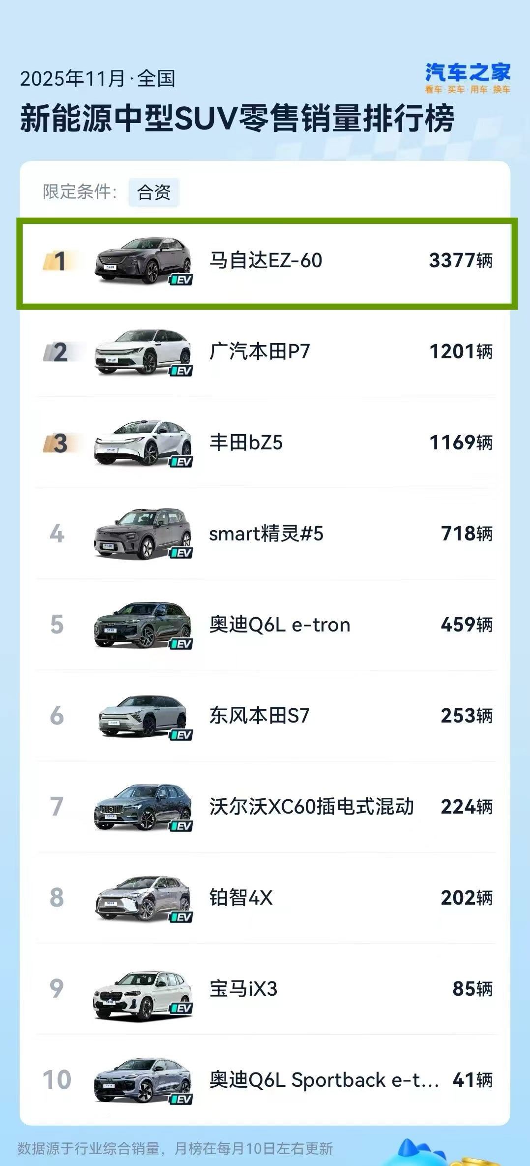 长安马自达的新能源车也好起来了。11月销量是合资厂商榜TOP5EZ-60登顶合资中型SUV销量NO.1EZ-6跻身合资轿车榜TOP7
