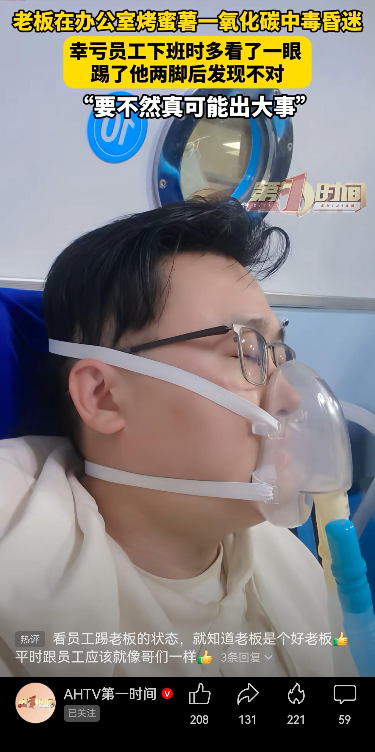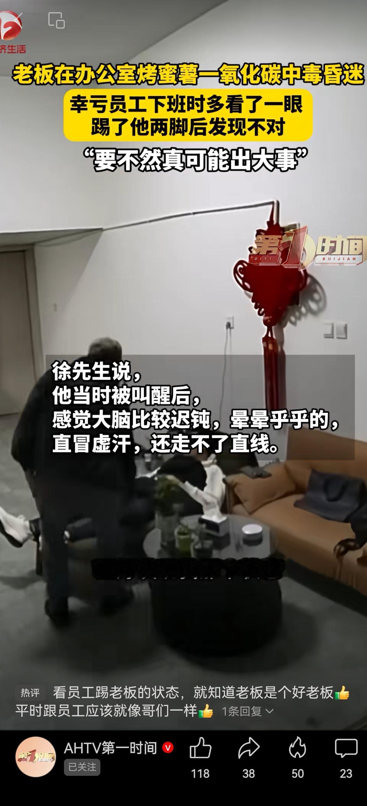 辛亏多看一眼啊!12月9日采访披露,山东青州一老板在办公室烤蜜薯,下班时间了还躺在沙发上,感觉睡着了。 下班时间到了,大家都走了,这时间有个老员工从楼上下来,也准备走了,看见老板睡在那儿,吼了一句:“下班了”! 一开始还以为他太累睡着了,喊了两声没反应。这要是换个人,可能打个招呼就走了,那老板真危险了! 可这员工用脚踢了一下老板的鞋底,又喊了一句:“下班了”!还是没反应,又接着踢了两脚鞋底,觉着不对劲,他立马意识到出事了,赶紧叫人,送医院抢救。 原来是老板用炭火烤红薯,炭火燃烧不充分,一氧化碳就悄悄冒出来了。老板自己没注意,慢慢就中毒昏睡了过去! 幸亏员工的这“一脚踢”啊!估计平时老板和员工的关系就和很融洽吧,所以员工才会这么自然地用脚踢一下。 老板接受采访时说自己很幸运,关键时候,幸亏这位员工多看了他一眼。其实应该是是老板平日里攒下的随和、人缘,让员工愿意多看一眼、多踢一“脚”。 所以说啊,老板这次能捡回条命,不是运气好,是他自己平时待人接物修来的福报。 好人缘,好人品关键时刻救了自己吧? 信息来源:AHTV第一时间