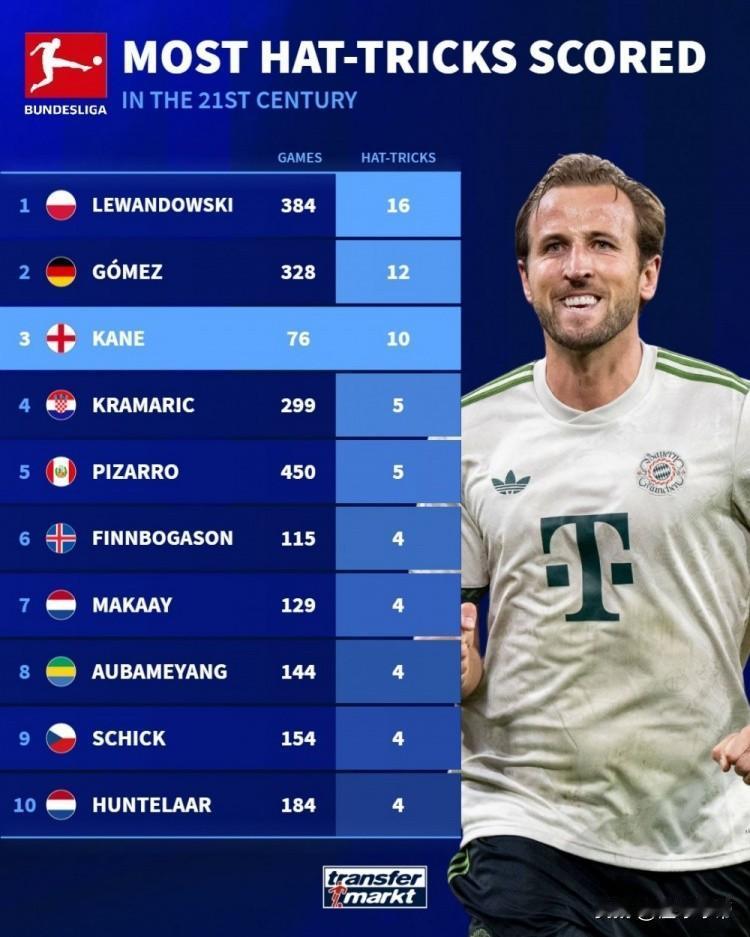 被热刺耽误的神锋,凯恩在德甲已经上演10次帽子戏法排名第三! 近日,权威足球机构《德国转会市场》盘点统计了21世纪德甲球员帽子戏法次数排名,其中莱万16次排名第一,戈麦斯以12次排名第二,刚来德甲不到三年的凯恩以10次排名第三。 莱万上演16次帽子戏法用了384场比赛,戈麦斯上演12次帽子戏法用了328场比赛,而凯恩上演10次帽子戏法则仅仅只用了76场比赛,进球效率恐怖如斯。 本赛季是凯恩加盟德甲的第三个赛季,为拜仁出战了76场德甲比赛贡献了79球21次助攻,合计已经参与了100球。 凯恩要是早点来拜仁的话,现在不仅冠军更多,进球也更多了,被热刺耽误的太久了,巅峰都被热刺给浪费了。