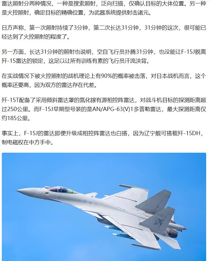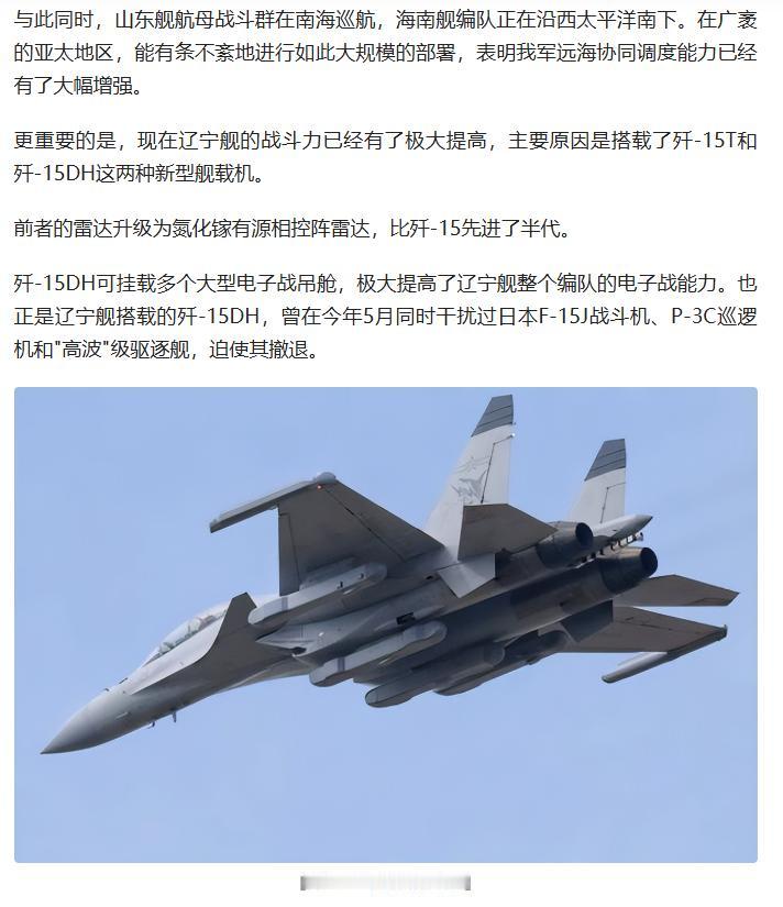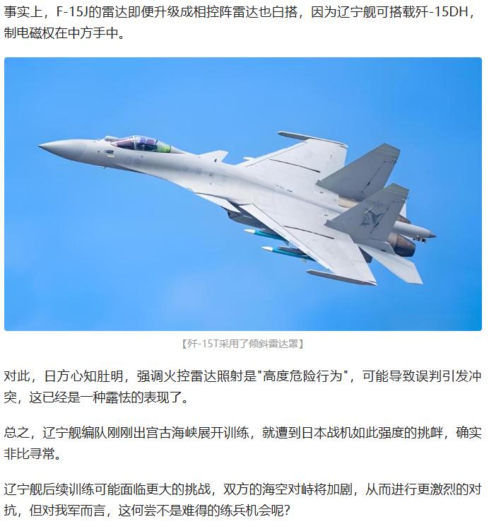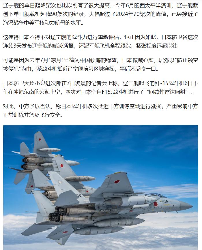歼 - 15 锁定 F-15J 长达 31 分钟,雷达代差下日方战机插翅难飞!辽宁舰携歼 - 15T/DH 新型舰载机西太平洋亮剑,单日 90 架次起降逼近美军水平,搭配 055 大驱扼守美日增援要道模拟 “速战速决”,双航母 + 两栖舰协同部署彰显远海战力,日本战机抵近滋扰反露怯,这场海空对峙既是挑衅更是我军绝佳练兵场! 原文来自:航空知识王亚男《歼15两次锁定F-15J,空自飞行员扑腾31分钟,被迫放弃窥探辽宁舰》