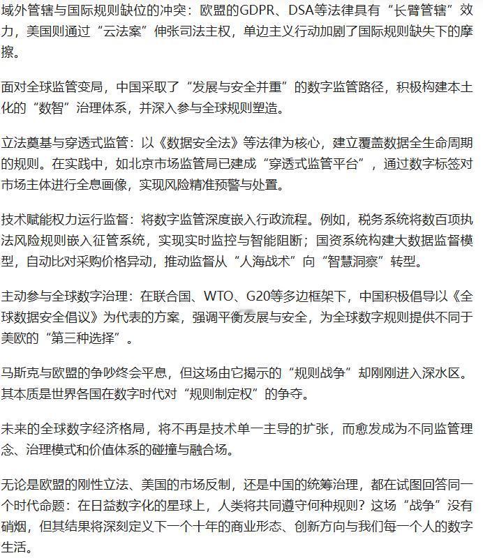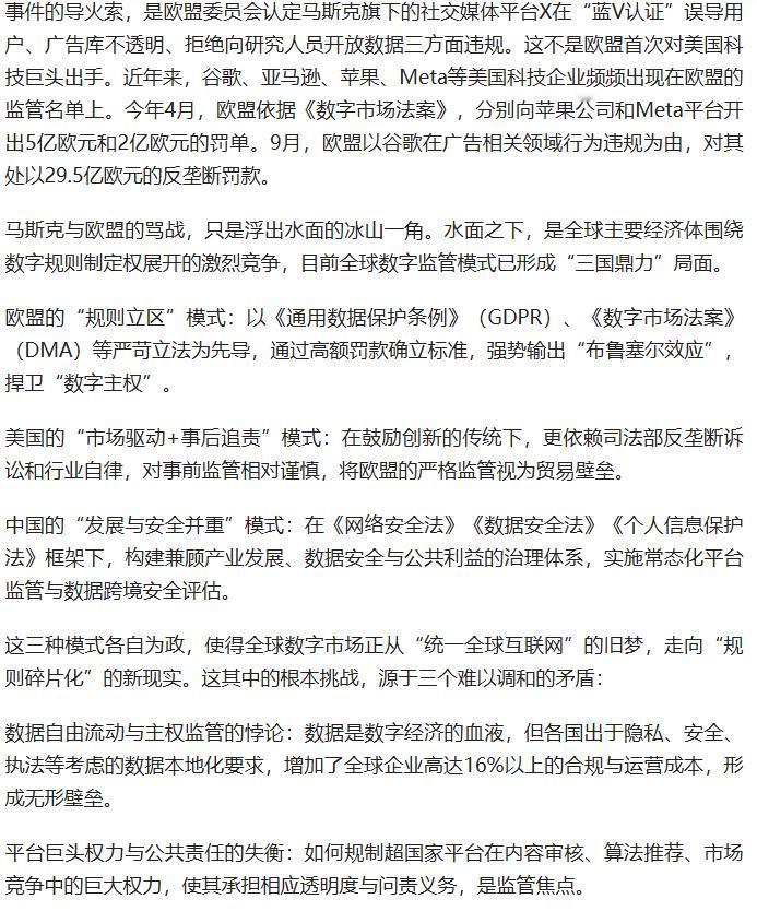 1.2 亿欧元罚单引爆马斯克与欧盟骂战,背后竟是全球数字规则的无硝烟战争! 欧盟刚性立法、美国市场驱动、中国统筹治理 “三国鼎立”,三大核心矛盾交织下,中国以 “数智治理 + 全球倡议” 突围,这场规则话语权争夺,终将重塑下一个十年的商业形态与每个人的数字生活! 原文来自:科工洞洞拐《废除欧盟的怒吼VS马斯克去火星的反击,游戏规则由谁制定?》