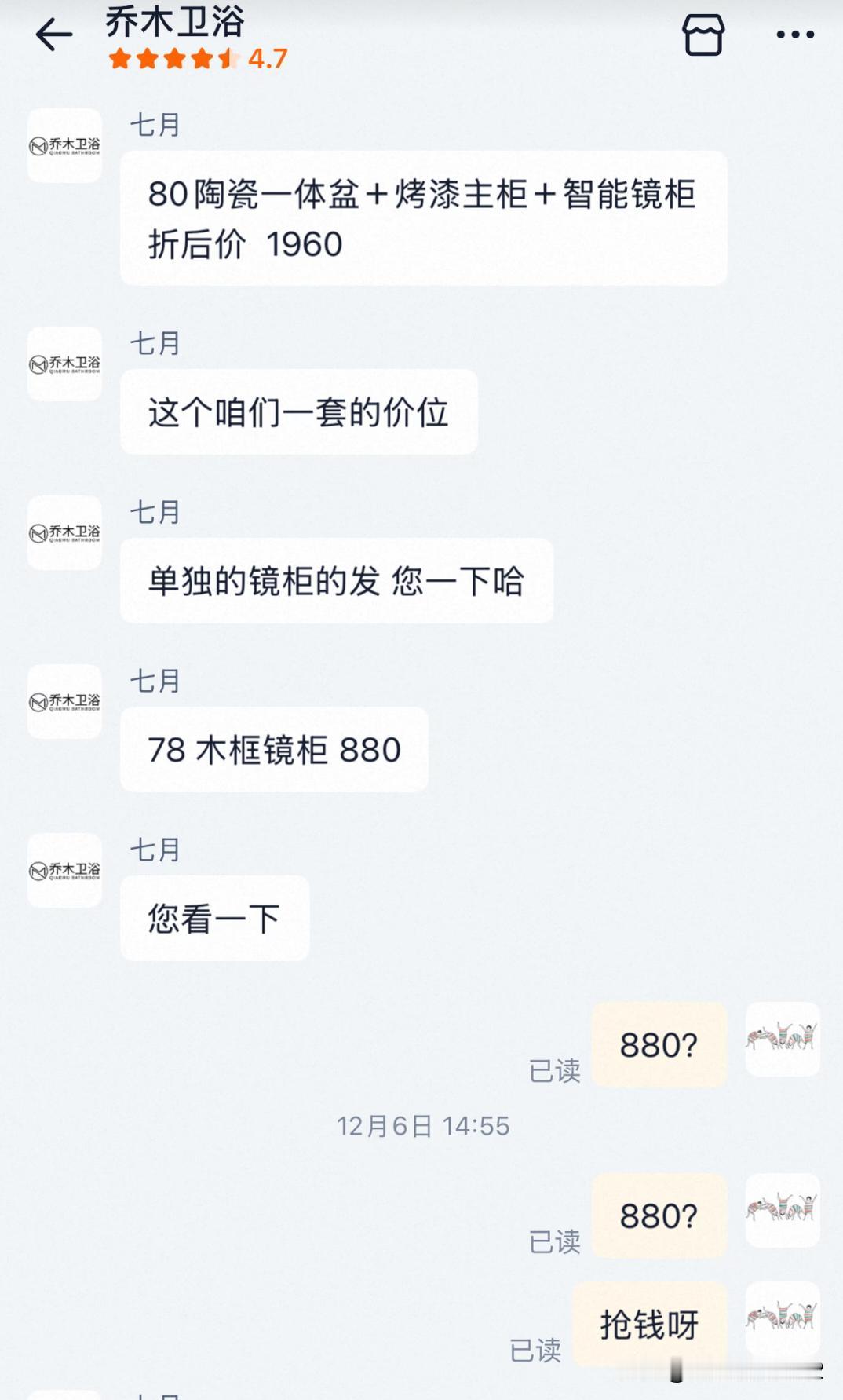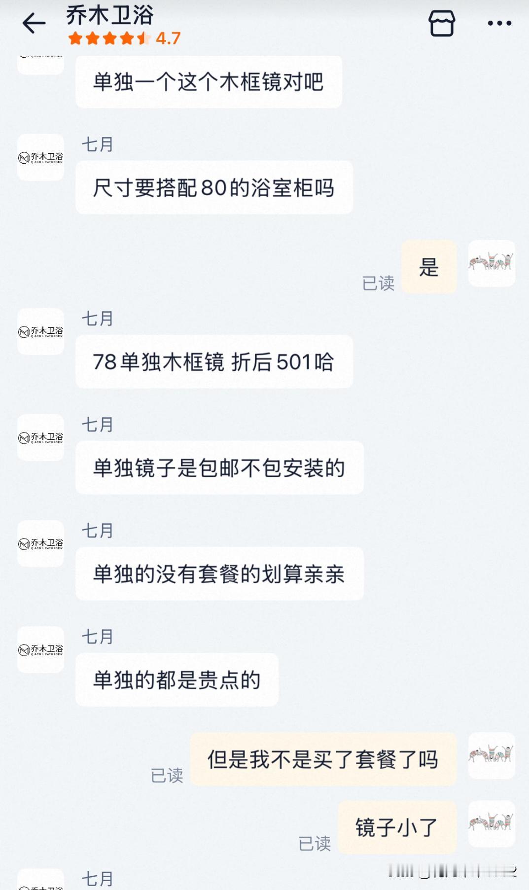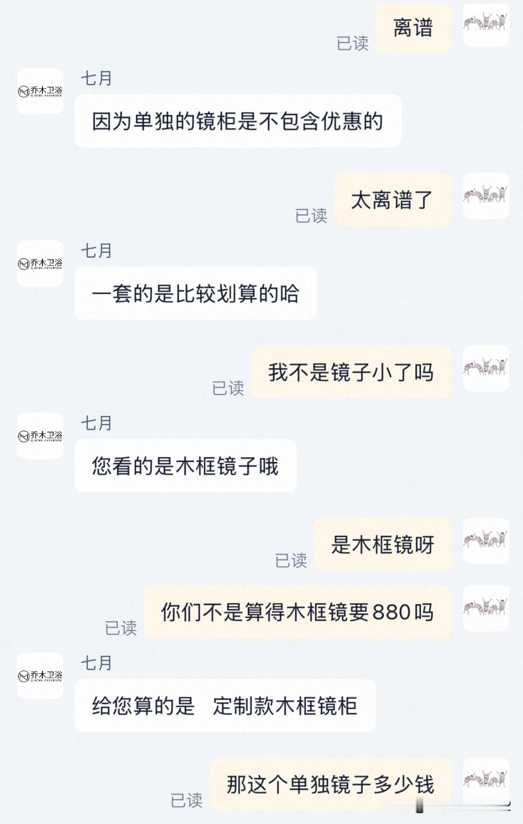 精装房处处是坑不说, 买的镜子小了想再单独配一个也是坑! 谁能想到精装房自带的镜子后面连瓷砖都不给贴满,买回来拆装的时候才发现小了! 看套装有镜子和没镜子只相差一百多(单独再出个运费也能接受),心想着再买一个吧,做高一些盖住没贴瓷砖的部分,一问价格单独镜子上来报价880,比套装一半价格还高,做大一点肯定还要加钱,离谱呀,离大谱呀。 只是个薄镜子又不带收纳柜为啥要这么贵呀(刚开始说880元没有优惠,后面又说优惠完501元,感觉有点胡乱叫价)