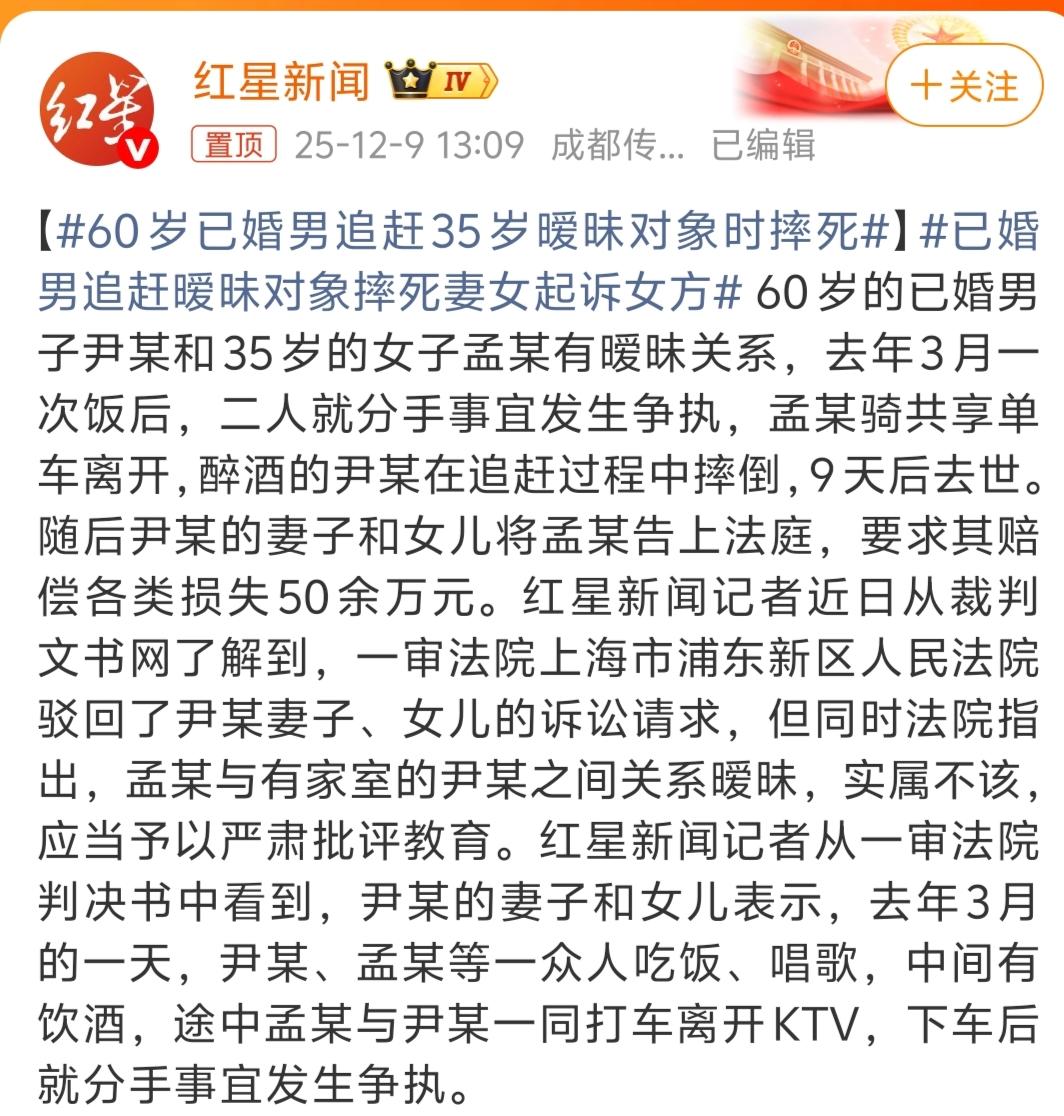 60岁已婚男追暧昧对象摔死,妻女索赔50万被拒。 60岁已婚男尹某,跟35岁孟某搞暧昧,酒后为了“分手”的事儿,追着骑共享单车的孟某跑,结果自己摔倒了,9天后人没了(死亡原因为心脏呼吸衰竭)。 转头尹某的老婆和女儿把孟某告了,张嘴向孟某要50万赔偿,理由是“孟某该送醉酒的尹某回家,其未尽护送义务且放任尹某追赶,属于间接杀人”。 结果法院直接驳回:法院认为尹某死因系心源性猝死,与饮酒、追赶无直接关联,尹某作为完全行为能力人,应对自身安全负责,孟某非聚餐组织者或劝酒人,无法律义务护送。况且尹某自己已婚出轨,喝酒、追人都是自找的,孟某也没义务管他! 不过法院也批评了孟某:跟有家室的人搞暧昧,这事儿干得不道德,对她进行了严肃的批评教育。 评论区都炸了:“自己老公出轨作死死了,还好意思找别人赔钱?脸呢?”“孟某是做的不对,但这锅真不该她背!” 咱就说这事,出轨在先、醉酒作妖在后,这事儿从头到尾都是尹某自己作的,家属想甩锅讹钱,法院这判决算是把理儿掰明白了,也没毛病!婚外情猝死 大爷摔伤致死 老人 60岁老人 婚外情 婚里婚外情