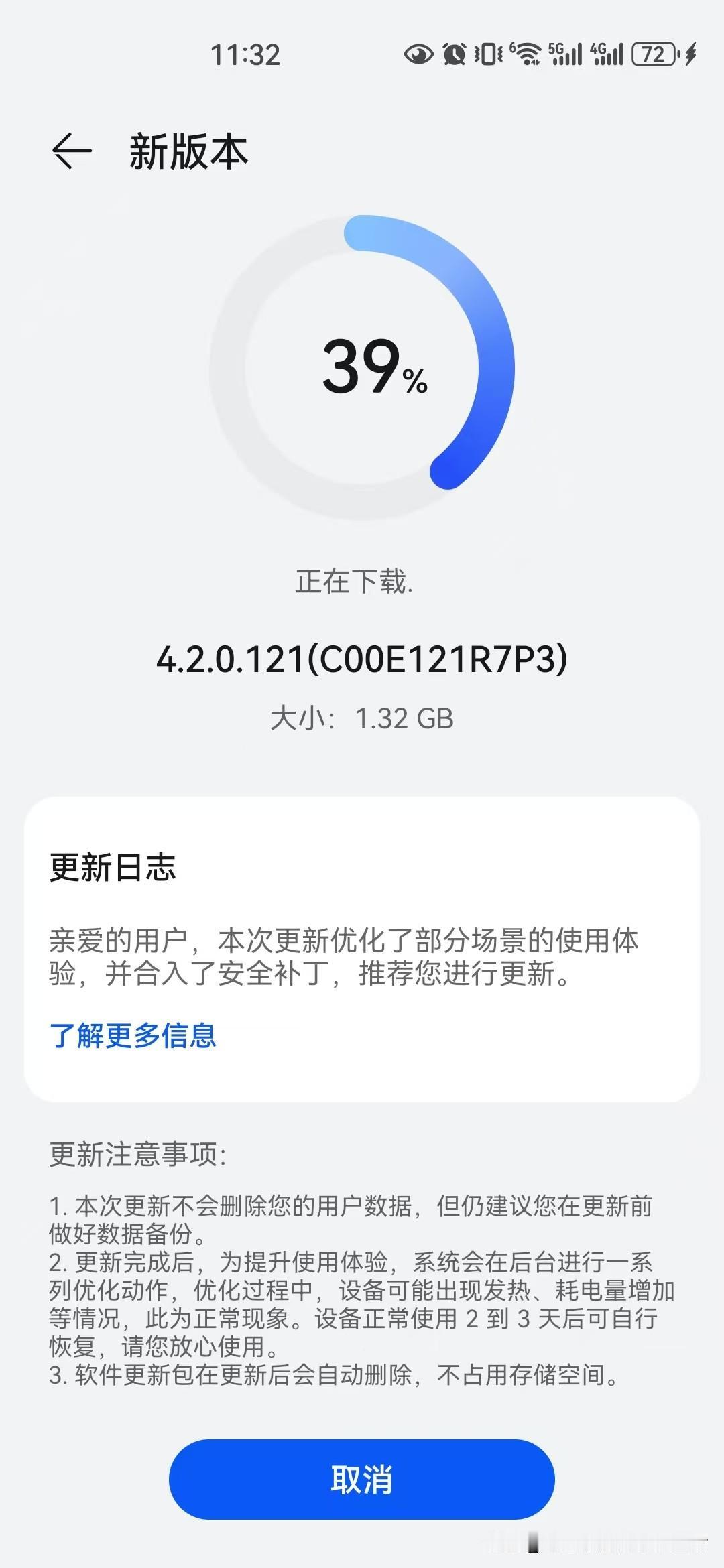 余承东又做了一件别人不敢做的事情! 感谢余承东没有忘记我们这些华为老用户! 我是华为P40手机用户,是2020年买的,到现在已经使用了快6年时间了,就在今天,收到了鸿蒙系统更新安装包的消息:发现新版本!鸿蒙4.2.0.121版本,更新日志是:亲爱的用户,本次更新优化了部分场景的使用体验,并合入了安全补丁,推荐您进行更新。 万万没想到啊,谁敢消息,5年前的手机了,华为没有忘记我们。用良心做事,用科技取胜,用实力说话,用质量保证,用事实证明,为华为点赞! 你们怎么看?