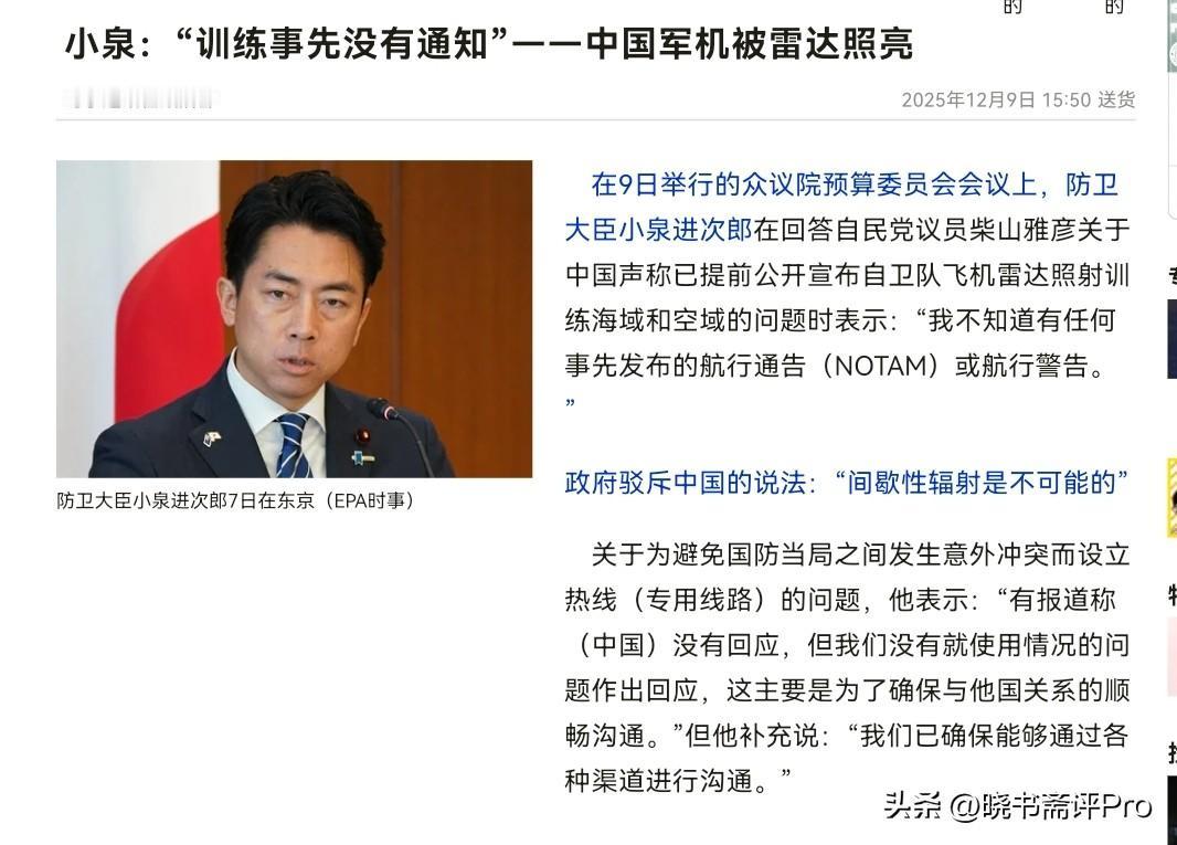 小泉进次郎反咬一口声称,我不知道有任何事先发布的航行通告或航行警告。 12月9日,根据日媒报道,在9日举行的众议院预算委员会会议上,日本防卫大臣小泉进次郎在回答自民党议员柴山雅彦关于中国声称已提前公开宣布自卫队飞机雷达照射训练海域和空域的问题时,小泉进次郎声称:我不知道有任何事先发布的航行通告或航行警告,而训练事先也没有进行通知。 为什么小泉进次郎进行这样的回复呢?一句话,那就是日本方面要故意混淆视听,把一起明明是日本挑衅在先的事件的责任,完全推给我们。但,毫无疑问,小泉进次郎在公开的说谎。事实是,12月辽宁舰编队赴西太平洋开展远海实战训练时,不仅提前通过国际组织发布了禁航公告,明确了训练区坐标和时段。 而在12月6日下午抵达冲绳本岛东南方向海域后,我们通过国际海事组织规定的16频道发布演训公告,划定了训练空域和禁航区。小泉进次郎声称没有收到航行通告或航行警告,难道此人的意思是我们要专门给日本进行通报,并把通报令放在此人的案头,点对点沟通,这才算通告吗?这岂不是非常的荒唐,恐怕日本也配不上这种特殊待遇? 再者,中日之间有专门的热线,如果日本方面真要是想要跟我们沟通,为什么日本方面不跟我们打电话沟通呢?一句自己不知道,就妄图把责任推卸的一干二净,以此掩饰日本挑衅在先的本质,这根本不可能。很显然,中方有没有通告,自然有自己的证据,容不得日本歪曲。日本方面一而再的掩饰,只能说日本确实是有意挑事。