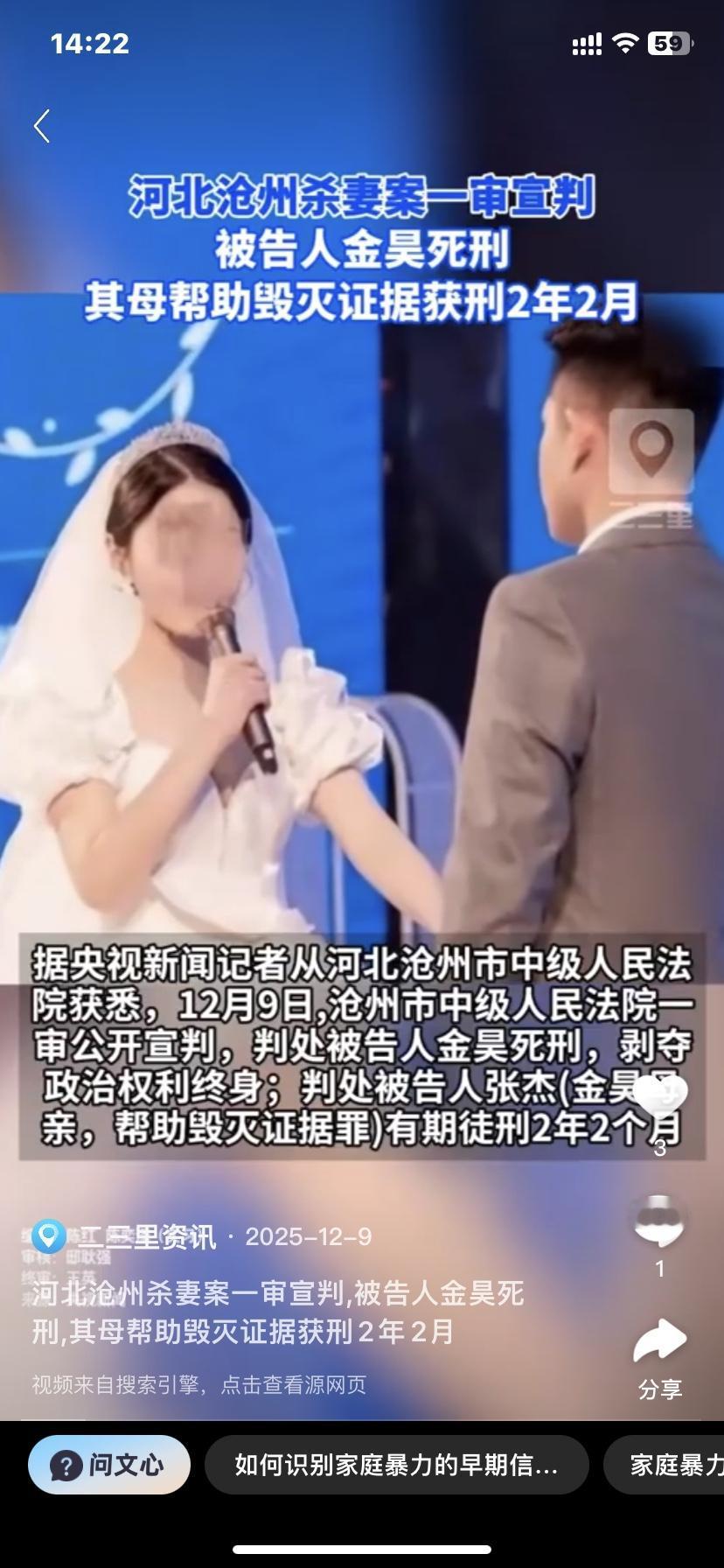 河北沧州杀妻案最新:金昊死刑,金母帮助其子毁灭证据,被判2年2个月! 金与瑶瑶两人高中同学,大学同学,从校服到婚纱,婚后两人育有一个可爱的儿子,原本幸福的一家三口,没想到被金亲手毁了。 瑶瑶漂亮大方,是好妻子好妈妈,可是遇人不淑。 金昊追求瑶瑶那么多年终于抱得美人归,他却不珍惜,据悉他刚结婚就家暴瑶瑶,更有甚者,他背叛婚姻,让瑶瑶伤心难过,最后还对枕边人痛下狠手,小金毛现在肯定悔死了。为了一个小三,打死了自己爱了几年的女人,毁了自己幸福的家庭 他们的孩子真可怜,小小年纪就没有爸妈了,他们三岁的孩子天天哭着喊着找妈妈。 金昊母亲没有选择劝其儿子自首、承担责任,而是试图毁灭证据、掩盖罪行。教子无方,害人不浅。 瑶瑶才25岁就香消玉殒真让人心疼,她如果不是因为心疼孩子不愿意与金离婚也许悲剧就不会发生了。痴情的女子多么的无辜,失去母爱的孩子多么的可怜,养大女孩的父母,一奶同胞的弟弟该如何走出这个伤痛 这件事的警示:婚姻选错了不是终点,能及时止损才是对自己、对爱自己、自己爱的人负责……