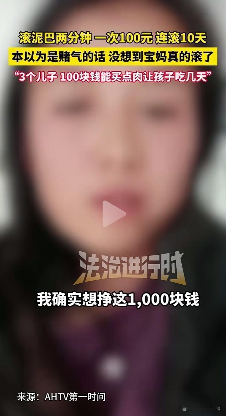 宝妈看到滚泥巴两分钟,一次100元的视频,发了个也想滚的评论,本以为是赌气,没想到宝妈真的滚了。 一名宝妈刷到一位大哥与同事打赌滚泥巴的视频,两分钟100元。宝妈在评论区随手留下评论,“如果有人愿意出钱,我也可以这样滚”。 没想到有人回复了,说他愿意出钱。滚泥巴两分钟,一次100元,连滚10天。 大哥也许只是当个玩笑,而且还增加到10天,想着女人都爱干净,谁会当真? 没想到女子一囗答应了,找个水塘边的泥水地,每天录下视频,一秒钟都不少。 女子说,她确实需要钱,一胎是儿子,二胎是双胞胎儿子,并且三个儿子尚小,100元钱可以给儿子们买肉,能吃上几天。 大哥兑现了承诺,给女子转了1000元,并说很愧疚。 女子说,大哥并没有恶意,也没想到她会滚,大哥也说到做到了,确实给了,大哥很愧疚,但她并没有生大哥的气,她确实想挣那1000元。 大哥言而有信令人钦佩,或许他开始只当作一场玩笑的赌局,当女子答应之后,他感觉到了女子的不容易,虽然心生愧疚,但是还是想继续下去,让女子心安理得的挣回钱,也算是帮助到了女子,他的愧疚更令人敬佩。 都说为母则刚,母爱如山。母亲可以为孩子卑微到尘埃,但她的爱丝毫不打折扣,没有啥比孩子更重要了。 虽然始于一场玩笑的赌局,但我们从他们两人身上看到了人性的亮点。大哥是个善良的人,女子是位伟大的母亲。