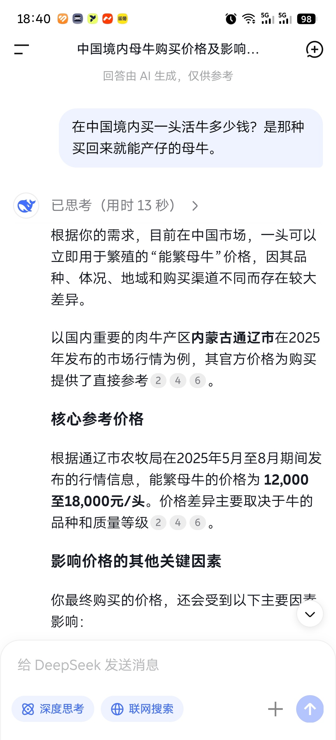 我印象里一头活牛要两三万来着现在价格跌的这么多?不过AI说1万还是买不着能下崽的母牛要12000~18000之间。