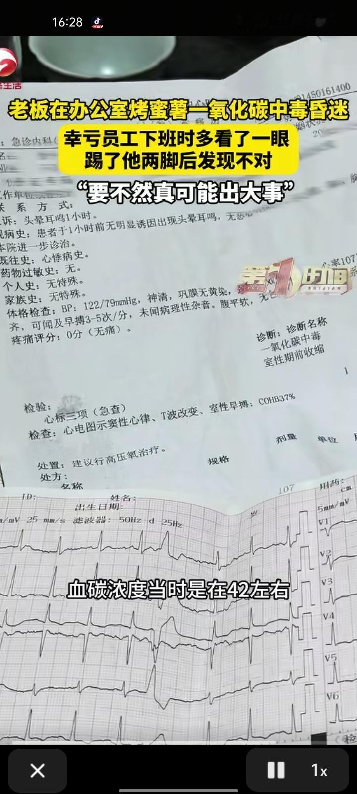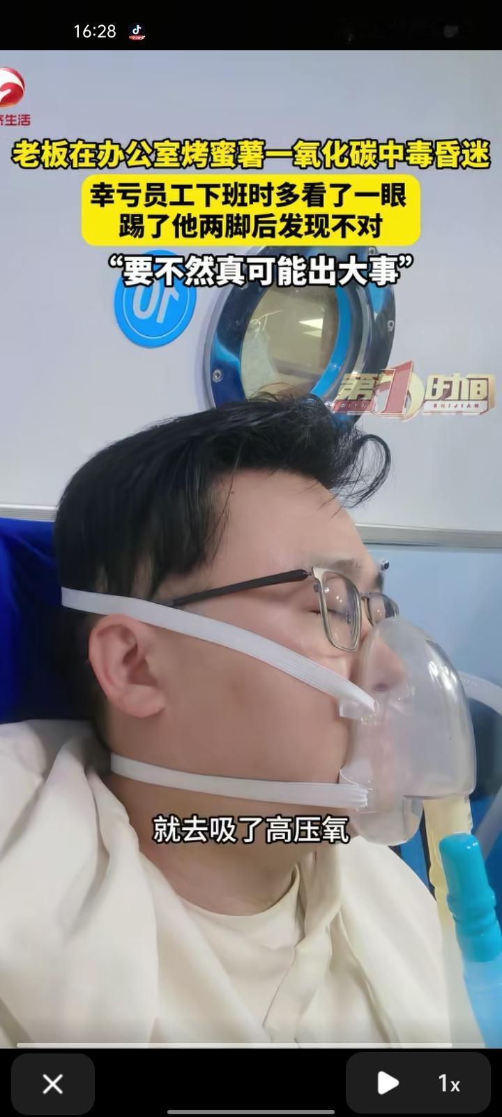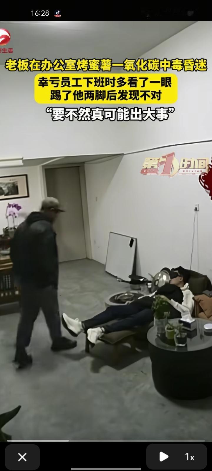 12月7日,潍坊青州市。监控画面显示,老板在烤地瓜时导致一氧化碳中毒昏迷,员工提醒老板“下班了”却没反应,踢了两脚就发现不对了。 当事人徐先生称,当时被叫醒后,感觉大脑比较迟钝,晕晕乎乎的直冒虚汗,还走不了直线。“幸亏他多看了我一眼,要不然真可能出大事了”。 徐先生去医院检查后发现,血碳浓度在42度左右,浓度超过50可能会有严重后果,吸了高压氧才好转。 事后,徐先生把当时没吃上的地瓜,开窗通风,又重新烤了吃,味道不错。