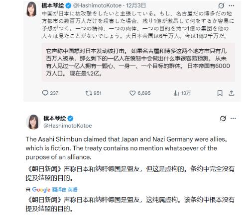 在日本右翼看来,若是中国对日展开核打击,数百万日本人的死亡,只不过是在帮日本进行军事动员,届时,中国面对的将是“日本帝国”的一亿日本人集团的反击。 之所以这么说,可不是凭空的夸张捏造,而是真的有人这么说,就在12月3日,日本右翼网红桥本琴绘发文就是这么表述的。 要知道,这只是她发表过的“暴论”的冰山一角,就在12月7日,她还否认二战期间的日本和纳粹德国的同盟关系,声称其是“虚构的”。 先看她的"人口算术题"。她算的是二战时日本6000万人敢打仗,现在1.2亿人就该翻两倍战斗力。这话就像说馒头蒸两倍大就能吃饱——压根不管面是生是熟。 现在的日本啥情况?年轻人下班累得连游戏都不想打,躺平的躺平,啃老的啃老,征兵体检都有三成年轻人跑不动400米。 去年日本自卫队招人,报名人数创30年新低,好些岗位凑不齐人。就这状况,还指望核爆之后一亿人扛枪反击? 广岛核爆时,日本军国主义喊"一亿玉碎"喊得震天响,结果美军第二颗原子弹下去,天皇第二天就广播投降了。 现在的日本社会,连加班都要抗议,真摊上核战争,怕是超市货架半小时就空,谁顾得上"复仇"? 再看她的"历史健忘症"。12月7日她刚发完"核反击"言论,转头又说二战时日本和德国的同盟是"虚构的"。 历史明摆着,1940年日德意签了《三国同盟条约》,日本偷袭珍珠港前,还跟德国密谈瓜分世界。桥本为啥装傻?因为她要洗白日本侵略史,给军国主义招魂。 就像她写书把侵略说成"解放亚洲",现在又把核反击幻想包装成"民族精神",根子上都是想推翻战后秩序。 最关键的是,她这套歪理背后有人撑腰。 日本政坛这几年右派闹腾得厉害,首相高市早苗公开说"台湾有事就是日本有事",防卫预算涨到11万亿日元,还偷偷研究攻击别国大坝的计划。桥本这种网红,就是他们养的"扩音器"。 你看她每次发癫狂言,评论区都有右派跟着喊"大和精神万岁",这哪是个人发疯,分明是有组织的舆论造势。他们怕啥?怕中国越来越强,怕日本年轻人不愿打仗,所以拼命制造"中国威胁论",想把老百姓绑上战车。 有人可能纳闷:中国承诺不首先用核武器,日本为啥老拿这说事?这叫"自我投射"。日本右翼心里一直憋着股劲:想搞核武器,想改和平宪法,想重温"大东亚共荣"的美梦。 去年他们偷偷摸摸讨论"核共享",被曝光后又装无辜。桥本说中国"会先用核武",其实是他们自己想拥有核武的借口。就像小偷总喊"有人偷东西",其实是想掩盖自己兜里的赃物。 再看现实差距。中国的东风导弹能打航母,歼-20战机成建制巡航,日本呢?买美国的"战斧"导弹要等到2026年,自卫队连远程雷达都缺。 更要命的是,日本1.2亿人里,65岁以上占30%,年轻人越来越少。 真打起来,让七旬老人扛枪?还是让小学生上战场?去年日本一项调查显示,只有9%的年轻人愿意"为国而战",这比例全球倒数。桥本说的"一亿复仇",说白了就是键盘上的狂欢,现实里连动员令都发不出去。 最后说说历史教训。1945年广岛被炸当天,日本军部还在喊"决战",可当裕仁天皇宣布投降时,那些喊打喊杀的高官,跑得比谁都快。 现在的日本社会,早没了军国主义那股邪火。 广岛幸存者佐久间邦彦说得实在:"核武器一响,啥都没了。"桥本之流非要把核战争写成热血漫画,不是蠢,是坏。 他们知道年轻人不信"玉碎"那套,就用极端言论刺激情绪,给右派夺权铺路。 咱们得明白,桥本的疯话不是笑话,是危险信号。日本右翼正借着各种"暴论",把国家往火坑里推。 从否认侵略历史,到鼓吹核反击,再到插手台湾问题,他们一步步突破底线。 中国早就不是1931年的中国,咱不惹事,但也不怕事。要是有人真敢玩火,历史会再次证明:任何逆潮流而动的军国主义幻想,最终都得撞得粉碎。
